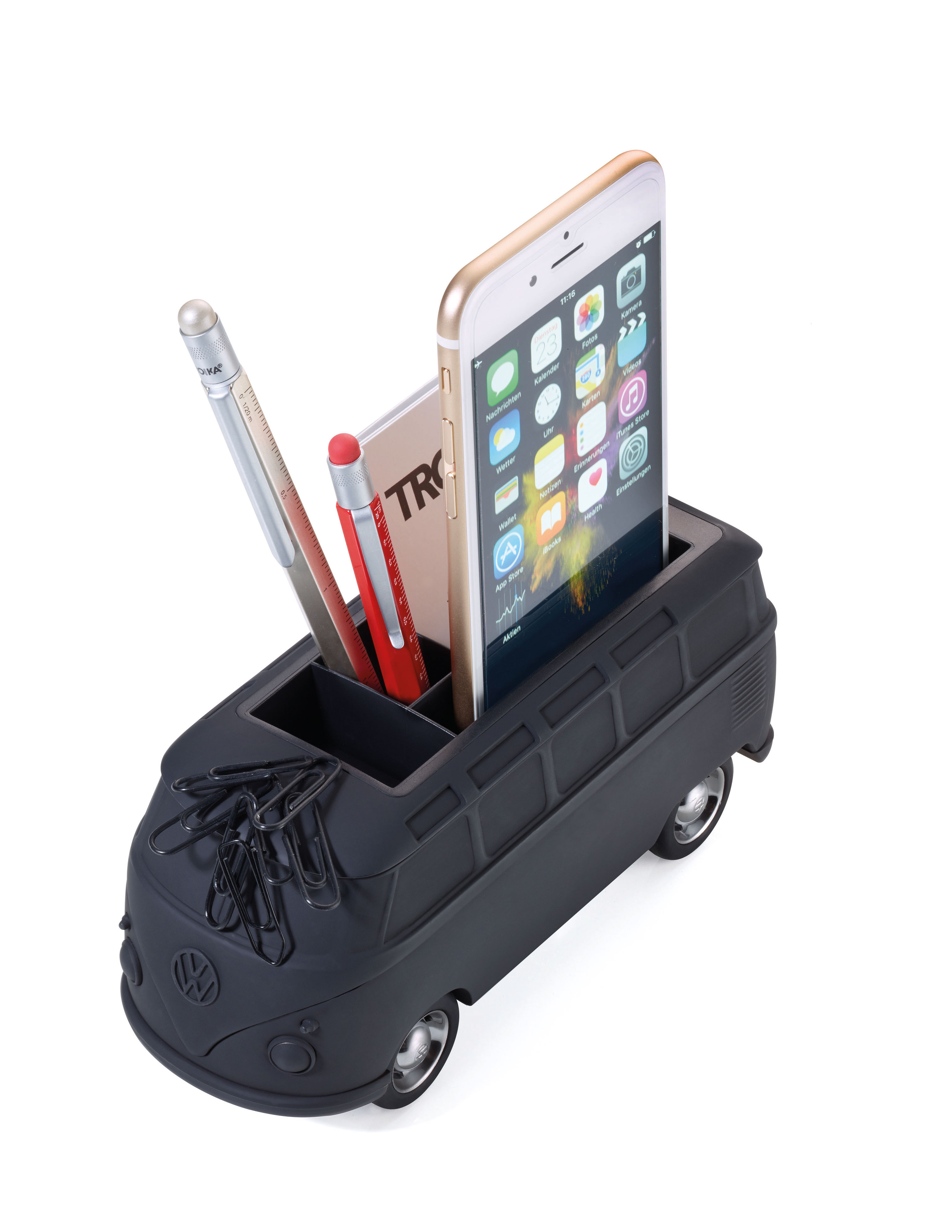 Stifteköcher und Schreibtischobjekt, VW Bulli (T1, Samba Bus, 1962), Rückziehmotor, integriertes Fach für Smartphones, Visitenkartenhalter, Magnet für Büroklammern, inkl. 5 Büroklammern, Metallguss, verchromt, glänzend, silber/schwarz Bulli goes Smartphone! Die Legende lebt und fährt als glänzend verchromtes Tischfahrzeug auf Ihrem Schreibtisch vor. Mit dem kräftigen Rückziehmotor macht der Bulli T1 ein längst vergessenes Fahr- und Lebensgefühl wieder lebendig. Seine aktuelle Komfortausstattung: Stifteköcher, Magnet, 5 Büroklammern und viel Platz für die Visitenkarten. Dazu ein vergrößertes Staufach z. B. für das aktuelle iPhone 6. Das liebenswerte Flair der alten Welt und die technische Faszination der neuen - zum Anfassen nah.