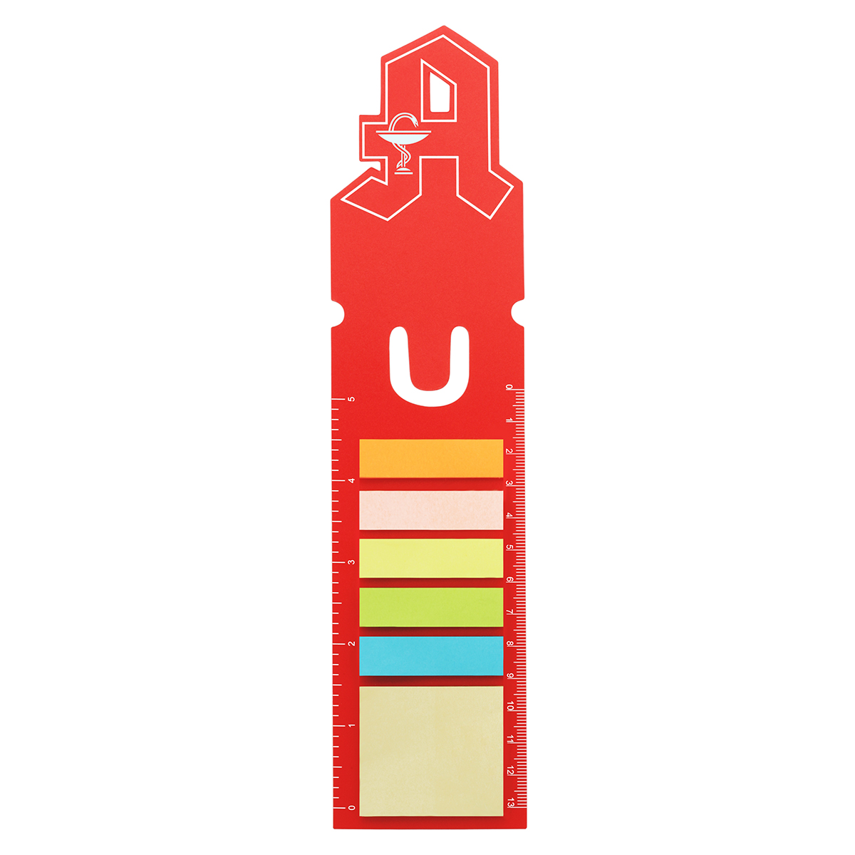Haftnotizen-Lesezeichen "Apotheke", mit jeweils ca. 25 Haftnotizmarkern in 6 verschiedenen Farben (ca. 12 x 45 mm und ca. 40 x 45 mm) und gedruckten Skalen (13 cm und 5 Inch). Besonders geeignet für Mailings..