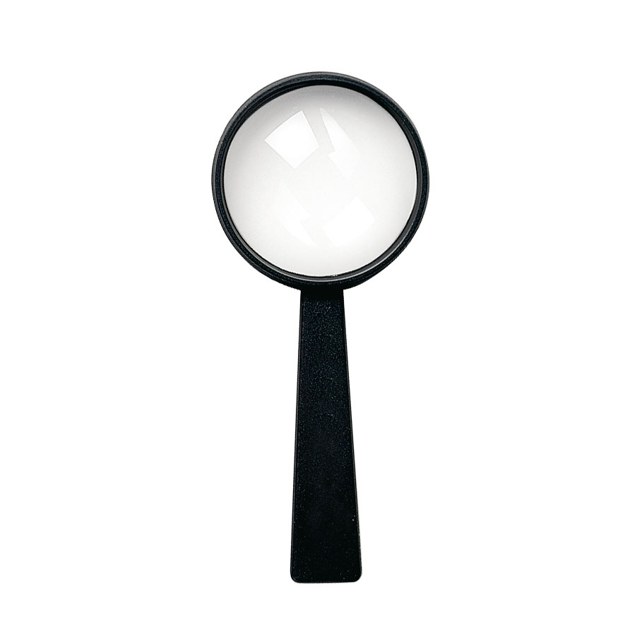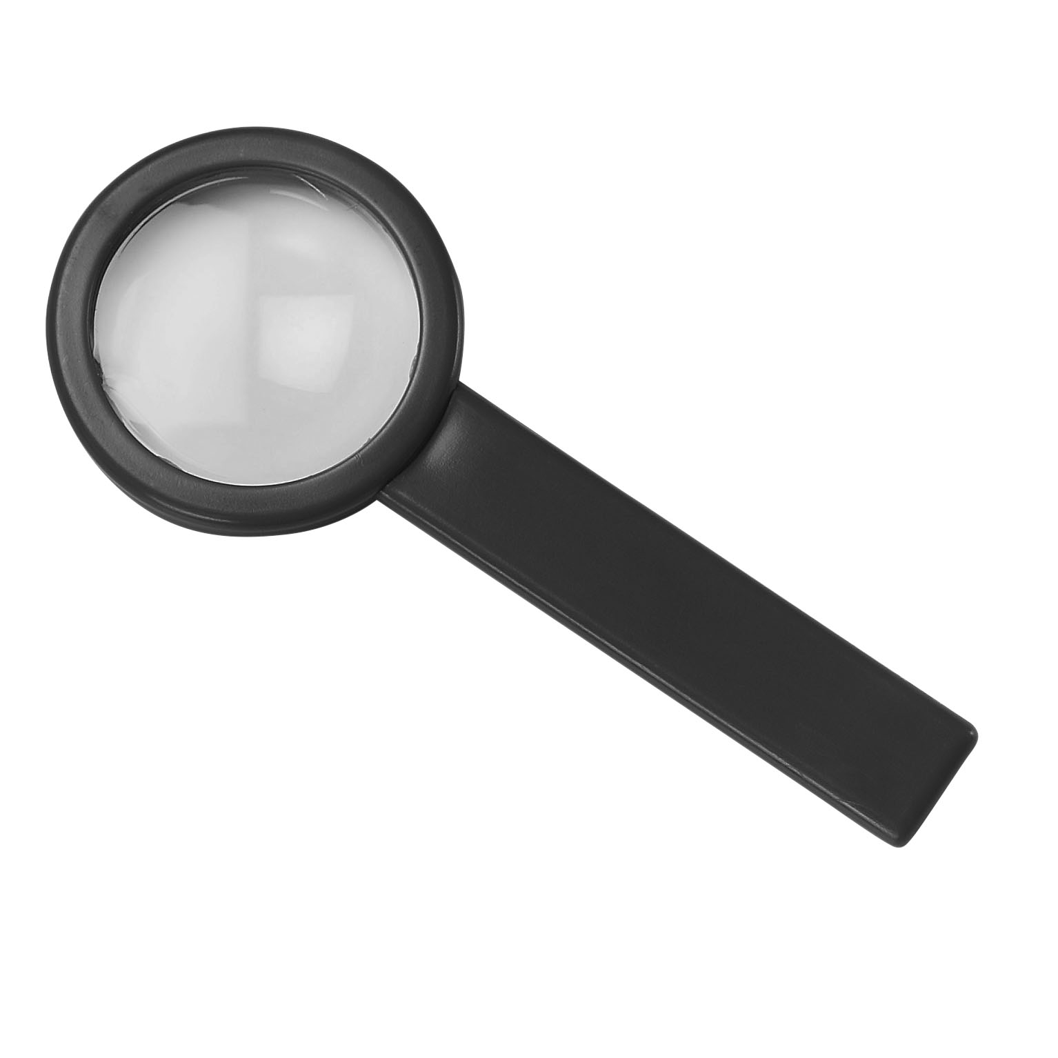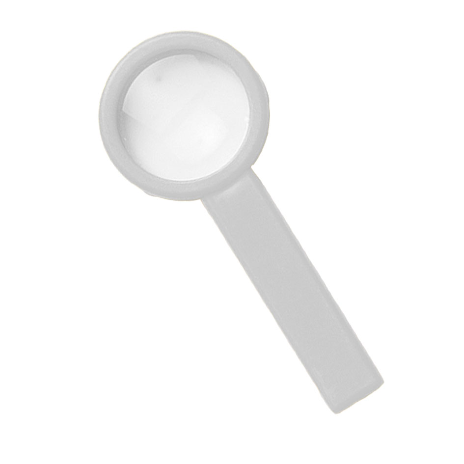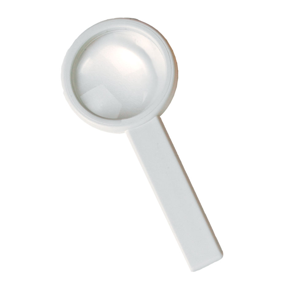 Lupe aus stabilem Kunststoff mit einem Durchmesser von 50 mm, 3-facher Vergrößerung und Stiel zum bequemen Halten.