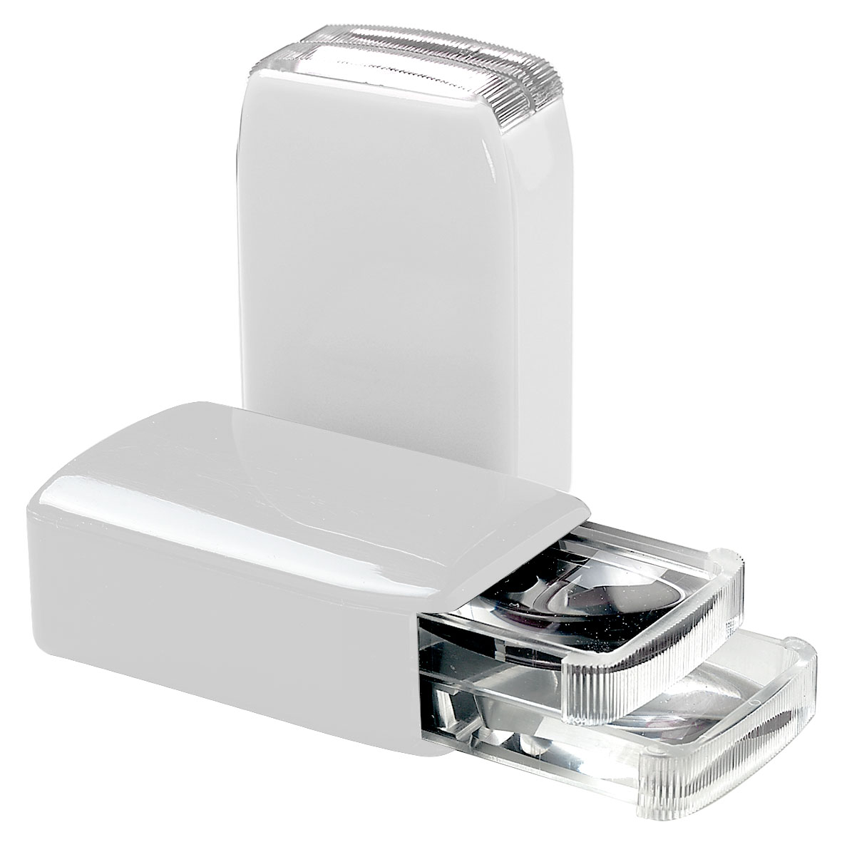 Lupe aus Kunststoff mit eingebautem weißen LED-Licht. Der breite Griff eignet sich hervorragend für einen Werbedruck in silber.