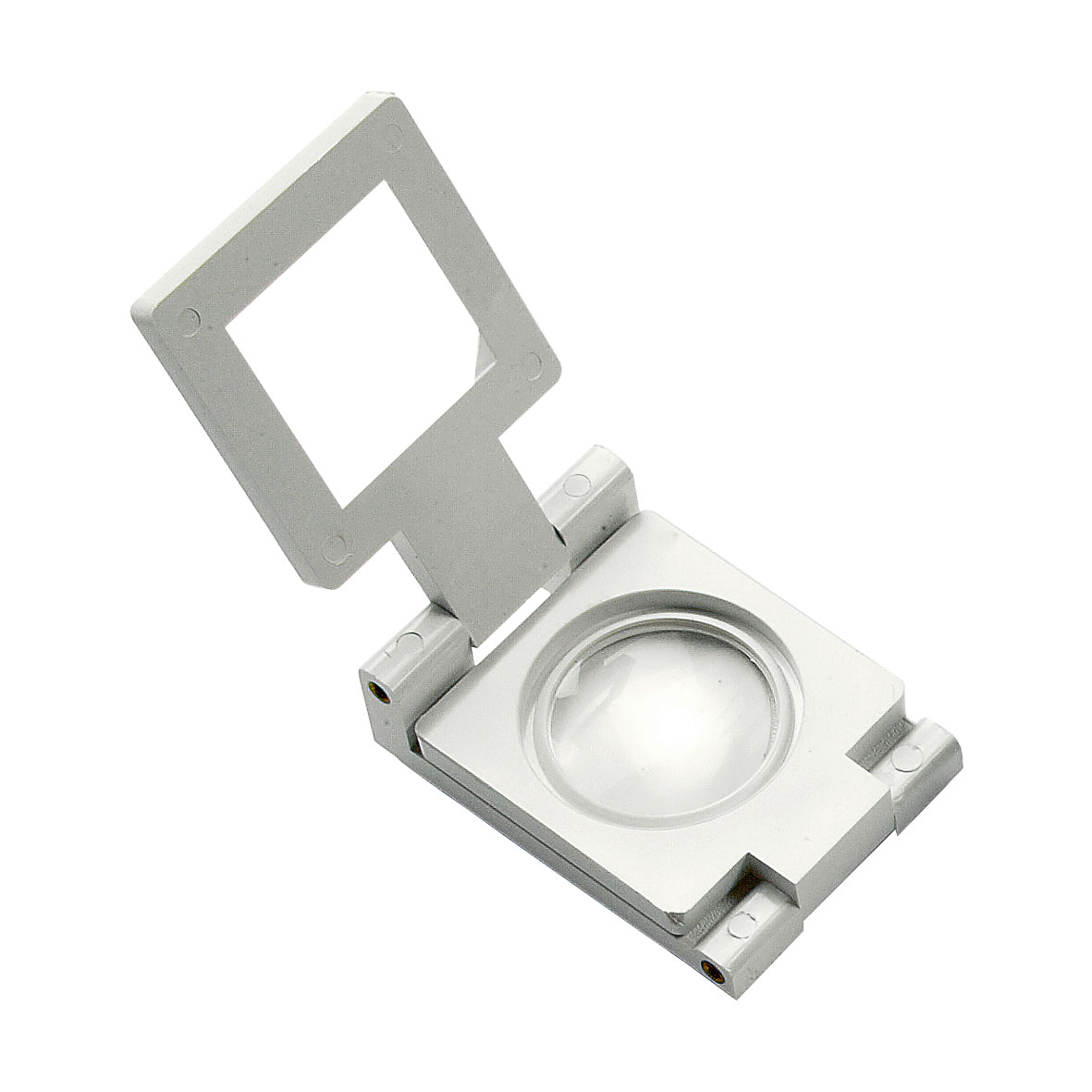 In Druckereien sehr beliebt. Aufklappbare Standlupe mit 5-facher Vergrößerung, 25 mm Linsenöffnung, 25 x 25 mm Gesichtsfeld und 25 g Gewicht.