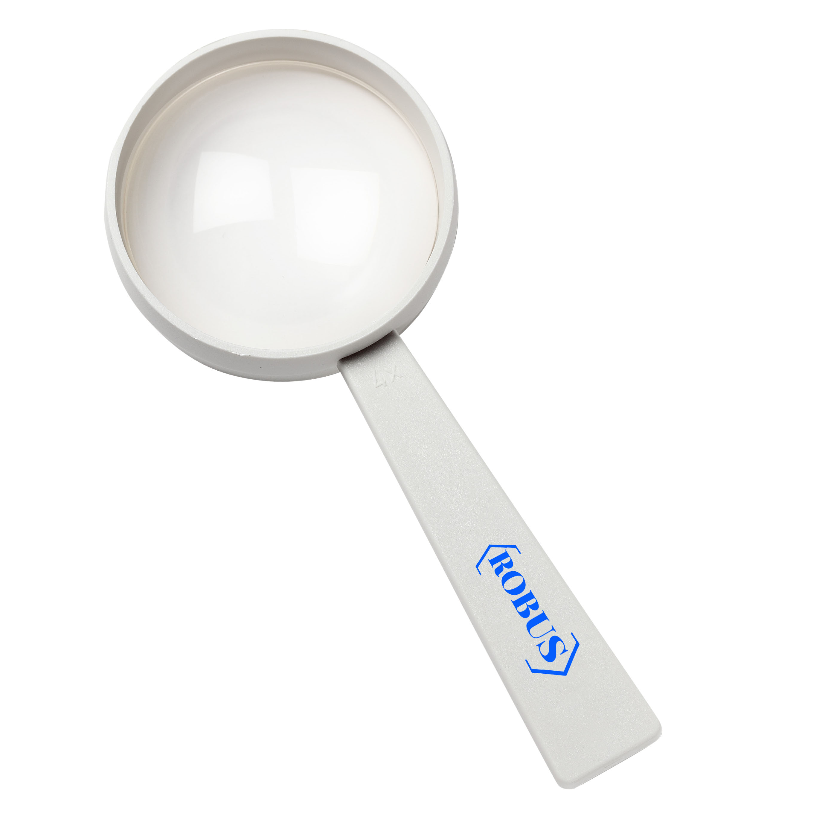Lupe aus stabilem Kunststoff mit einem Durchmesser von 60 mm, 4-facher Vergrößerung und Stiel zum bequemen Halten. Mit spezieller, asphärischer Linse.