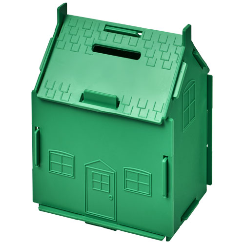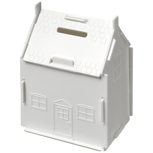 Unit Spardose aus Kunststoff in Hausform. Diese Spardose ist eine gute Wahl zur Präsentation Ihrer Marke auf dem Schreibtisch Ihrer Kunden. Flach verpackt geliefert. PS-Kunststoff.