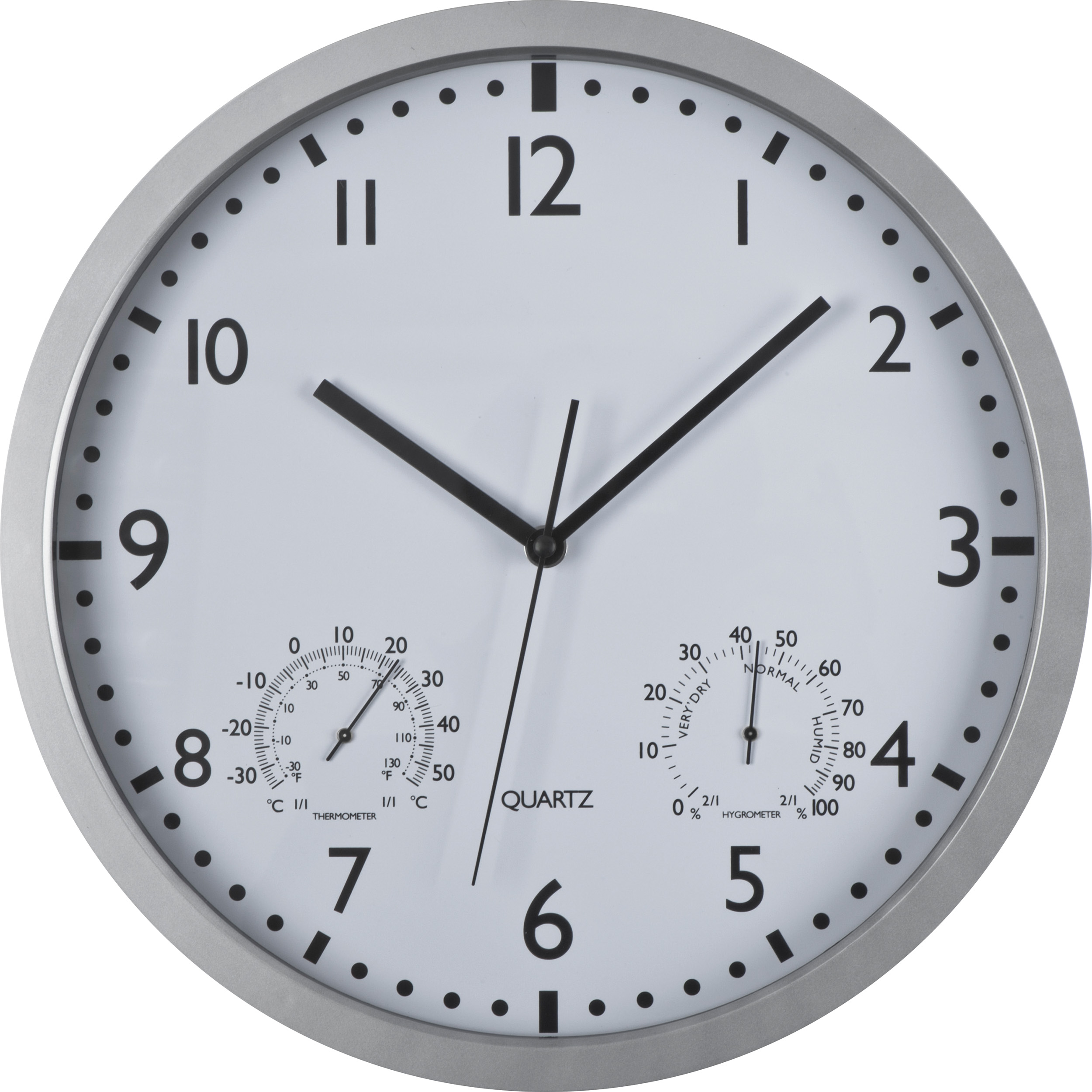 Schick und schlicht - somit ideal für Ihre Werbung ist diese Wanduhr mit Hygrometer und Thermometer. Ihre Werbung wird auf dem Werbeplättchen unterhalb der Zwölf angebracht.
