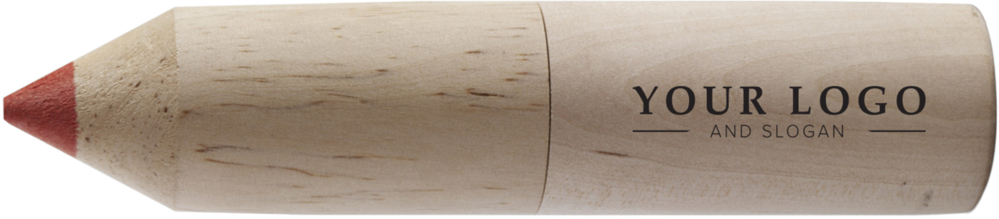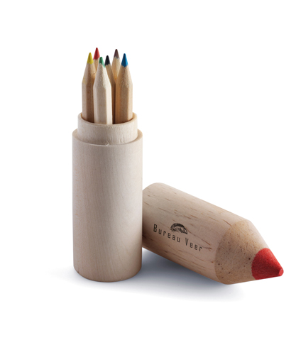 Buntstiftset in Holzbox, mit 6 Buntstiften (blau, grün, rot, gelb, braun und schwarz).