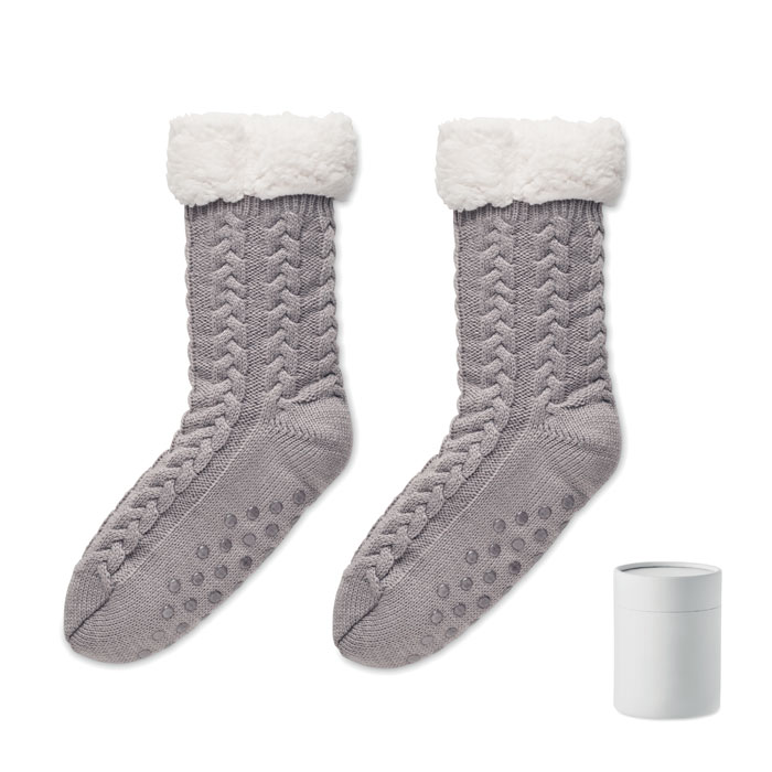 Socken mit Zopfstrickmuster und Anti-Rutsch-Sohle. Acrylgarn mit Sherpa- Futter 240 g/m². Lieferung in Hülse aus Papier. Größe L entspricht 40-43.