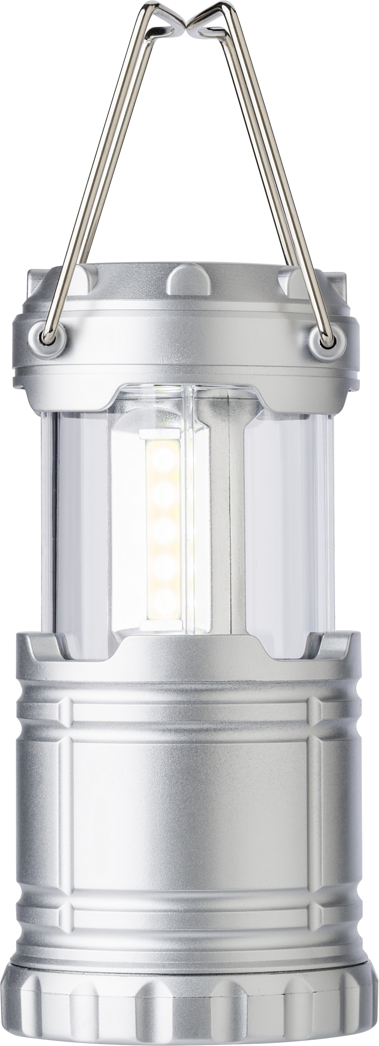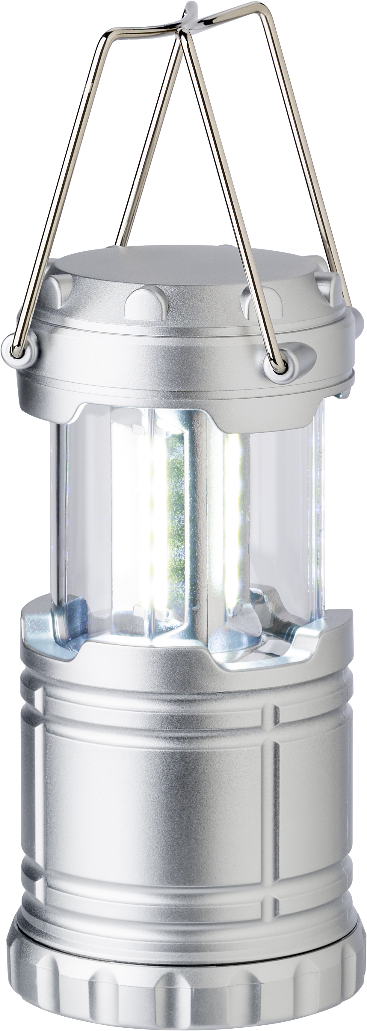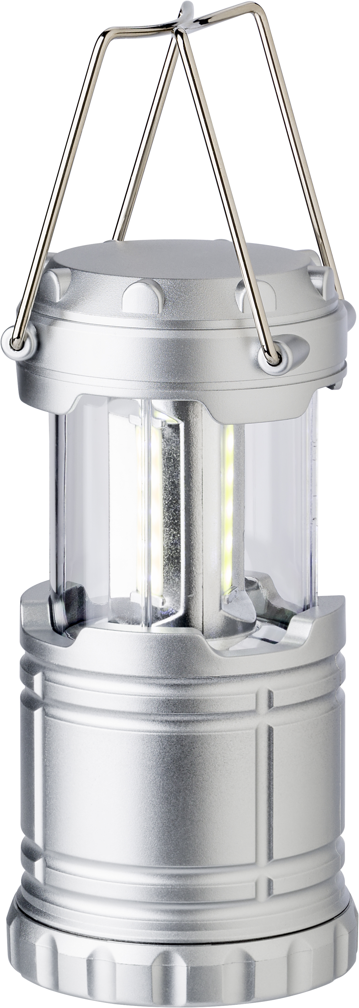 Campinglampe mit drei COB-Leuchtstreifen und zwei Griffen aus Metall. Die Leuchte ist ein-/ausfahrbar.