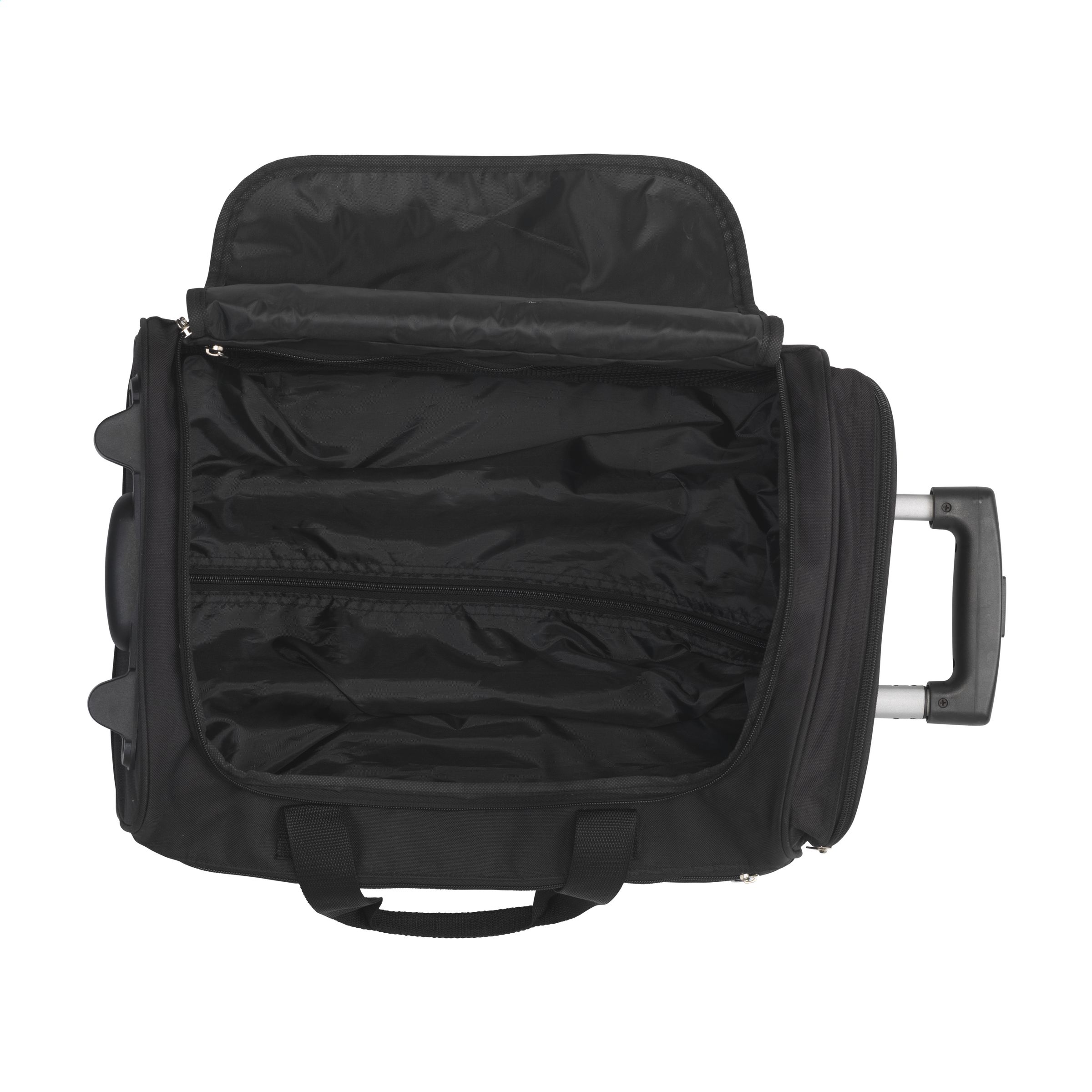 Praktische, handgepäckgeeignete 18-Zoll-Trolley-/Wochenendtasche aus 600D-Polyester. Mit ausziehbarem Griff, 2 Rädern, Trageschlaufen und einem Griff. Dies bietet die Möglichkeit, die Tasche auf verschiedene Arten zu transportieren. Die Tasche hat ein großes Hauptfach, 2 Reißverschlusstaschen und eine Netztasche mit Reißverschluss an der Innenseite. Fassungsvermögen ca. 35 Liter.