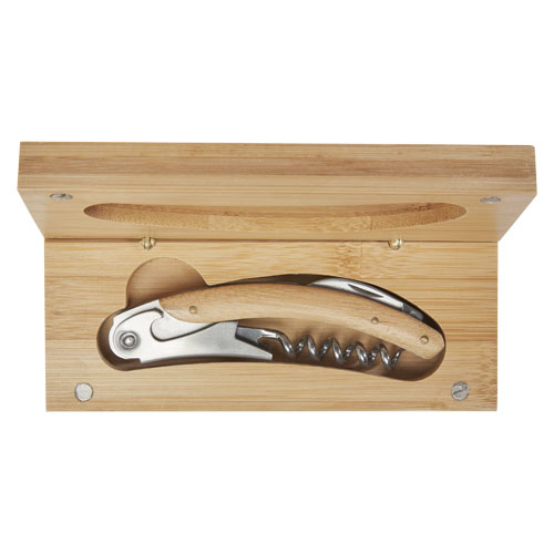 Kellnermesser aus Edelstahl mit Korkenzieher und einziehbarem Folienmesser, mit natürlichem Bambus am Griff. Der verwendete Bambus wird nach nachhaltigen Normen beschafft und produziert.