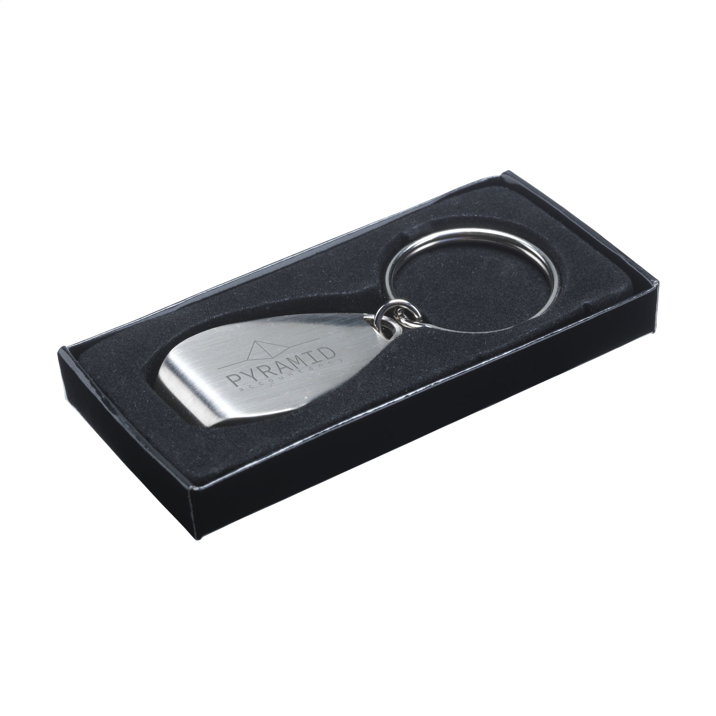 Schlüsselanhänger mit Flaschenöffner aus Mattstahl. Wird einzeln in einem Umschlag aus Kraftpapier geliefert.