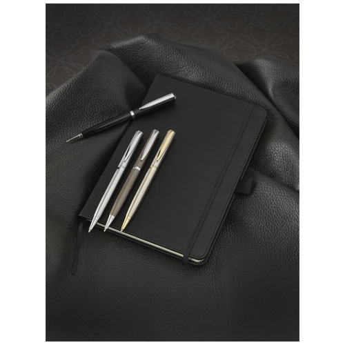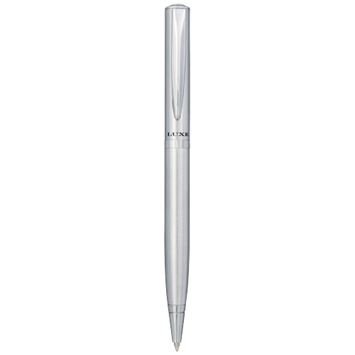 Der leichte Kugelschreiber kommt mit einem exklusiven Design, erhältlich in einer matt-gebürsteten Gold-Ausführung mit goldfarbenen Akzenten und matt-gebürstetem Silber mit chromfarbenen Akzenten. Inklusive einer hochwertigen schwarzen Ersatzmine und verpackt in einer „LUXE“-Geschenkschachtel (16,5 x 4,5 x 2,8 cm).