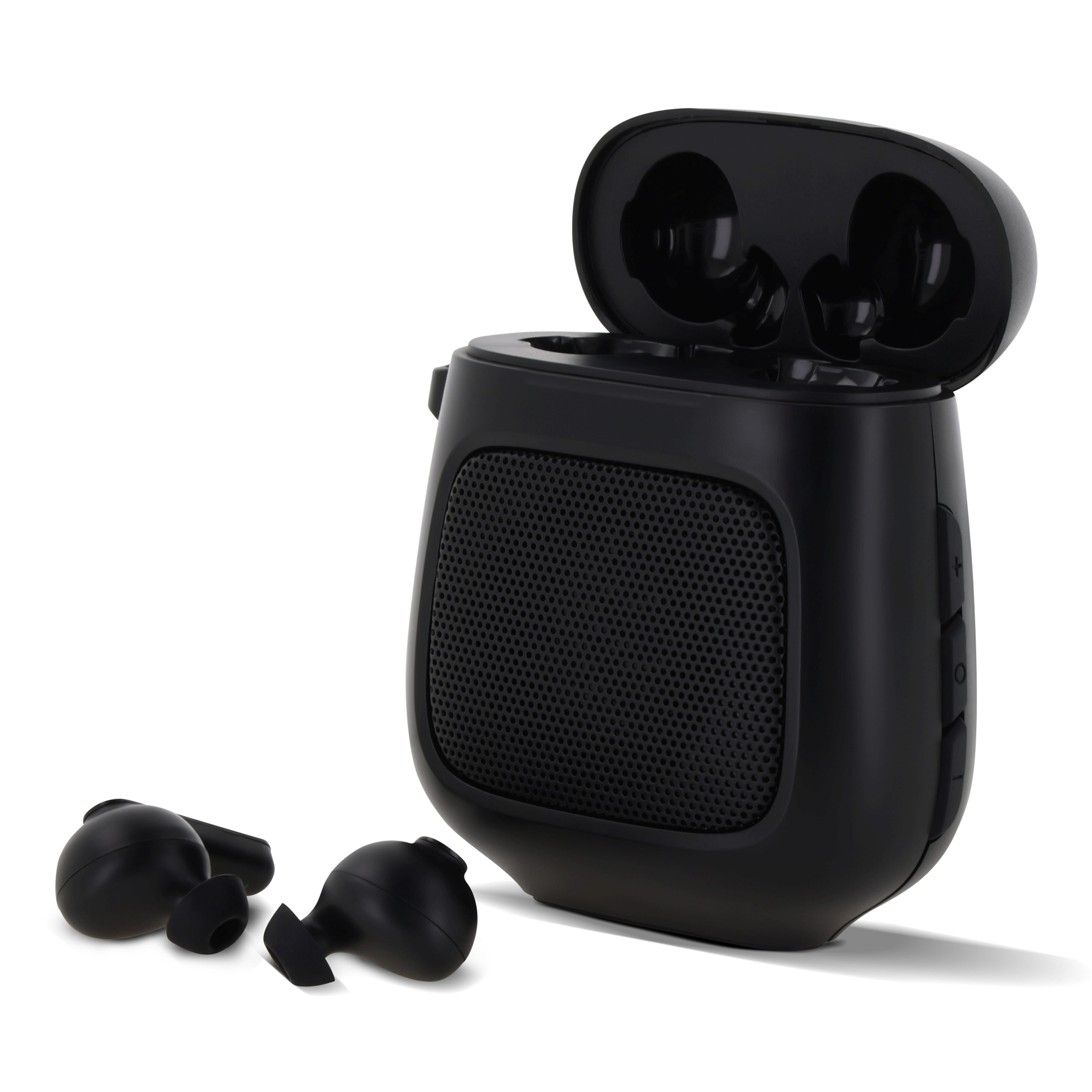 <p>Kombination aus Ohrhörer und Lautsprecher. Sie können Ihre Musik über den Lautsprecher, oder über die Ohrhörer genießen. Sowohl die Ohrstöpsel als auch der Lautsprecher lassen sich ganz einfach drahtlos verbinden.</p><ul><li>Geschenkverpackung: Ja</li><li>Batterien: Ja, Lithium-Ion</li><li>Kapazität in mAh: 600 mAh</li><li>Ladezeit: 3,5 Stunden</li><li>Bluetooth: Ja</li></ul>