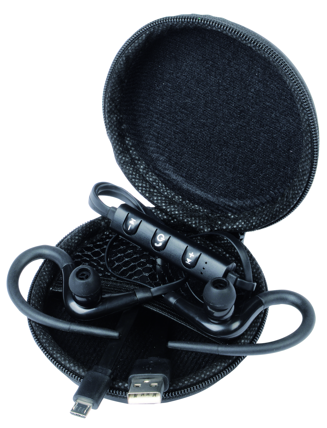 In-Ear Kopfhörer SPORTY: mit Bluetooth-Version 4.1, inkl. Freisprechfunktion, Reichweite: ca. 10 m, Controller mit Taste für Rufannahme/-beendigung, Lautstärkeregler und Track Vor- und Zurücktaste, inkl. USB-Aufladekabel mit Micro-USB-Stecker (Länge ca. 20 cm), leistungsstarker Polymer-Akku, Kapazität: 3.7V/80 mAh, Ausgangsleistung: 2 x 2 mW, Aufbewahrung in farblich passender Reißverschlussbox, inkl. Netzfach für das Ladekabel