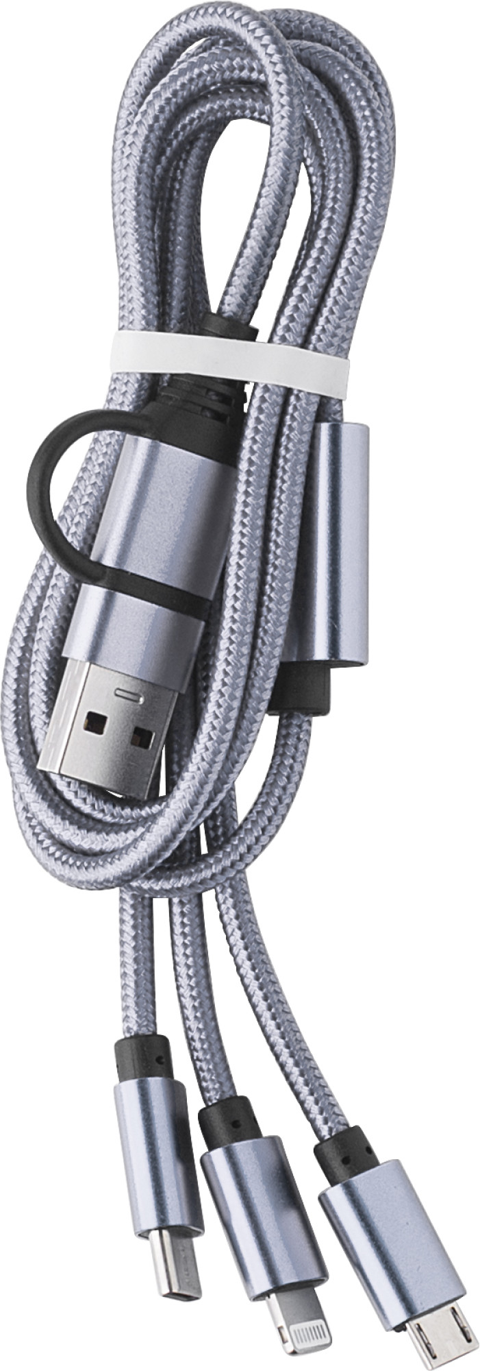 4-in-1-Ladekabel aus recyceltem Aluminium mit Schlüsselanhänger und einer maximalen Ausgangsleistung von 10W. Dank der USB-A- und Typ-C-Eingangsanschlüsse in Kombination mit den Typ-C- und Lightning/Micro-USB-Kombi-Ausgangsanschlüssen (unterstützt Apple iOS- und Android-Geräte) können die meisten Smartphones, Kameras, Powerbanks und Ohrhörer aufgeladen werden.