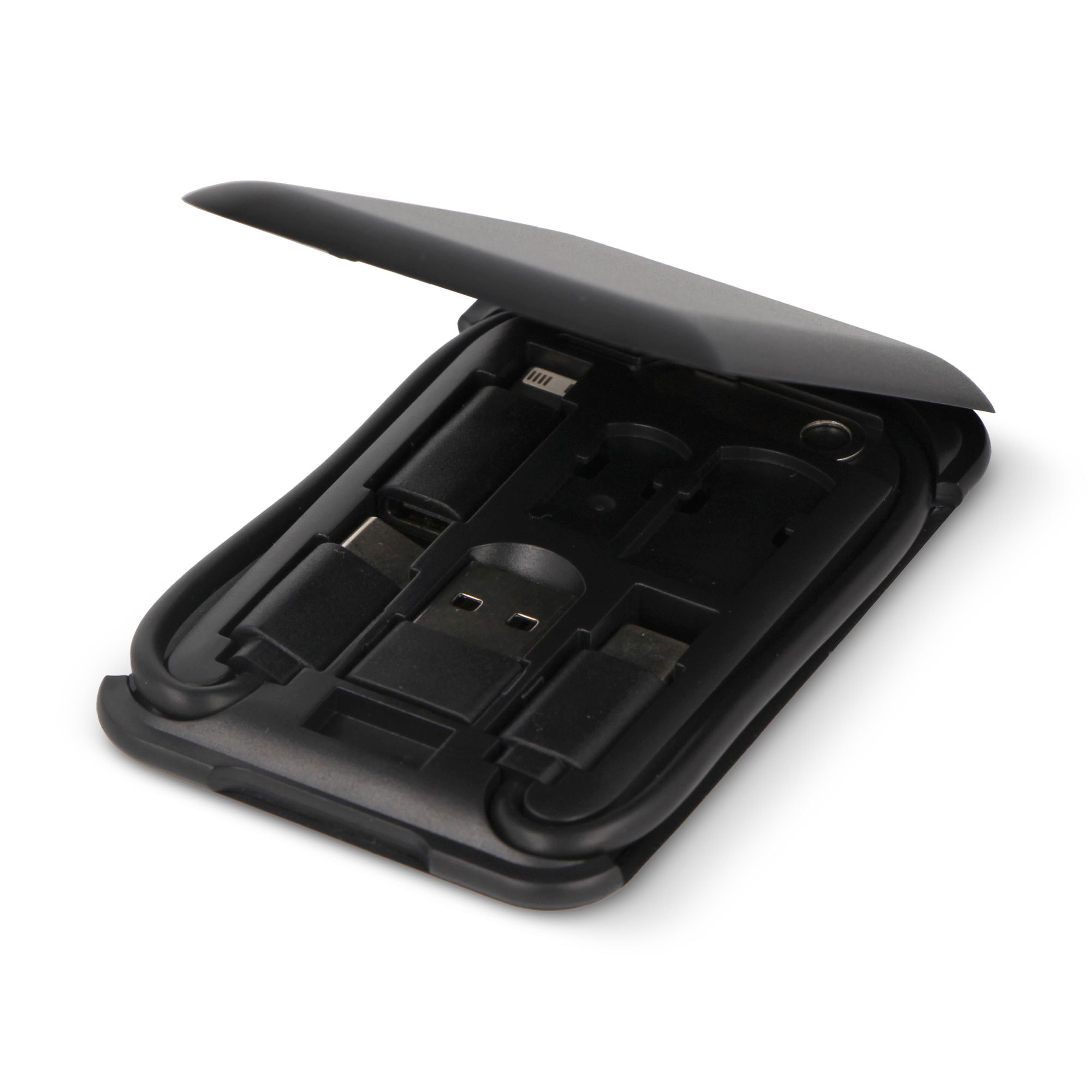 4-in-1 Ladekabelset mit einem Haken. Das Set hat einen USB-, USB-C-, Mikro-USB- und Lightning-Stecker (nur einseitig). Nach der Lasergravur leuchtet das Logo auf, wenn das Kabel in Gebrauch ist.