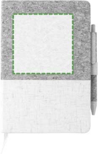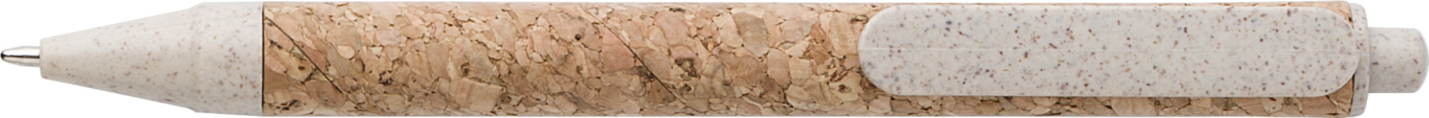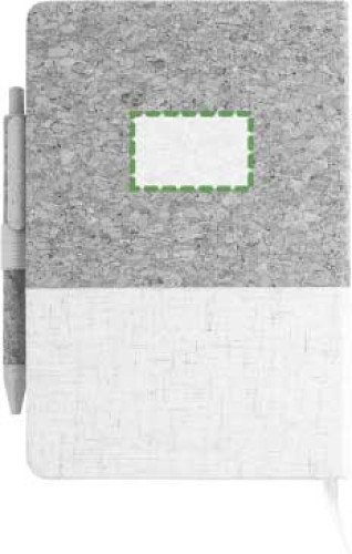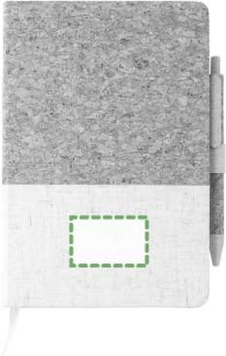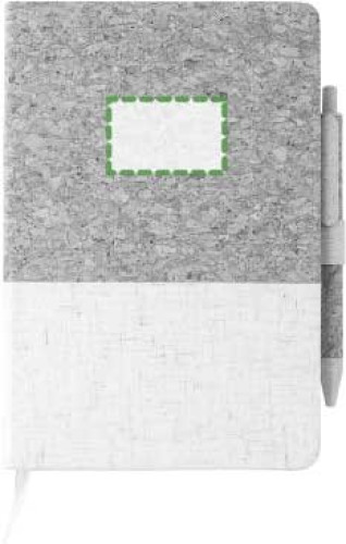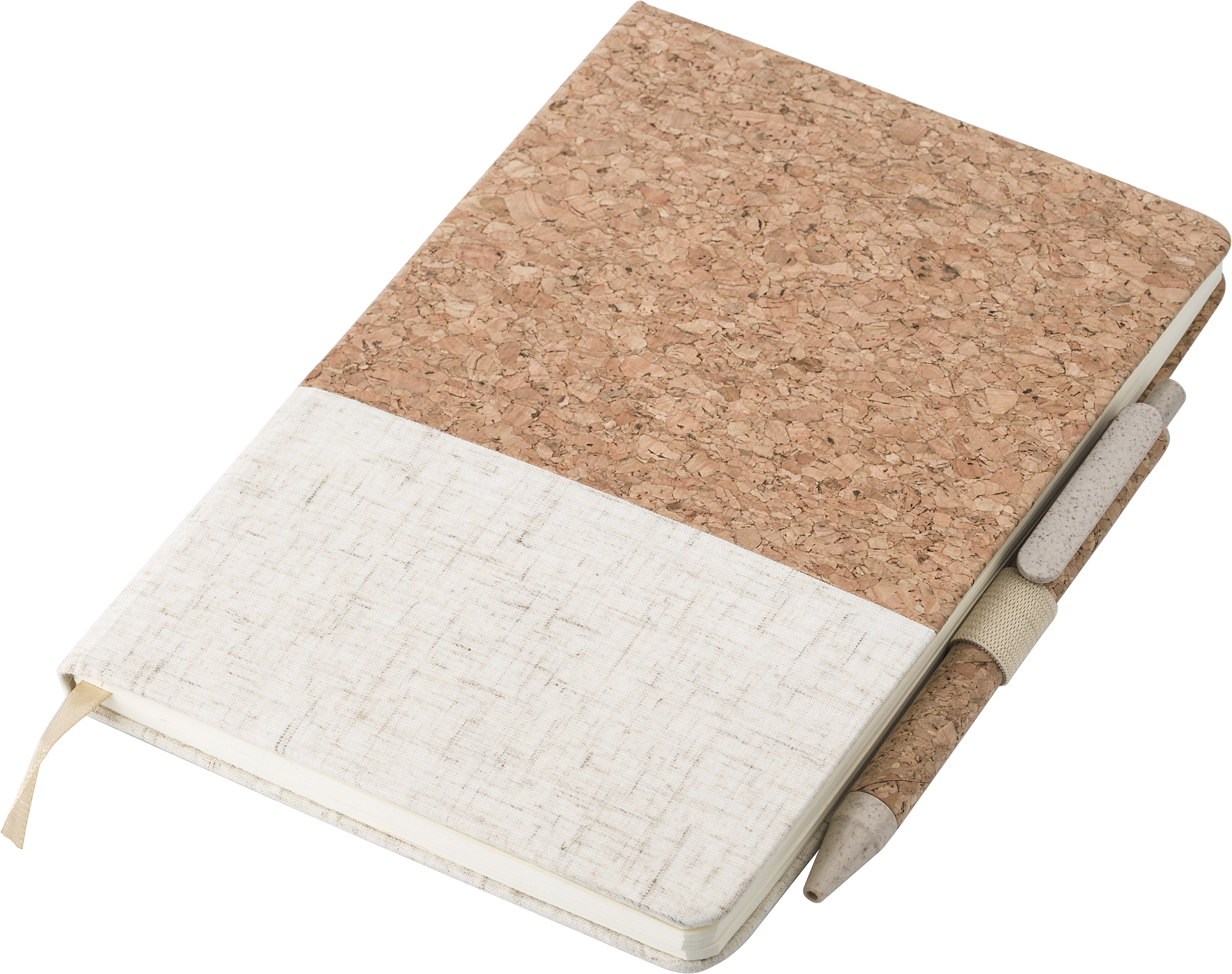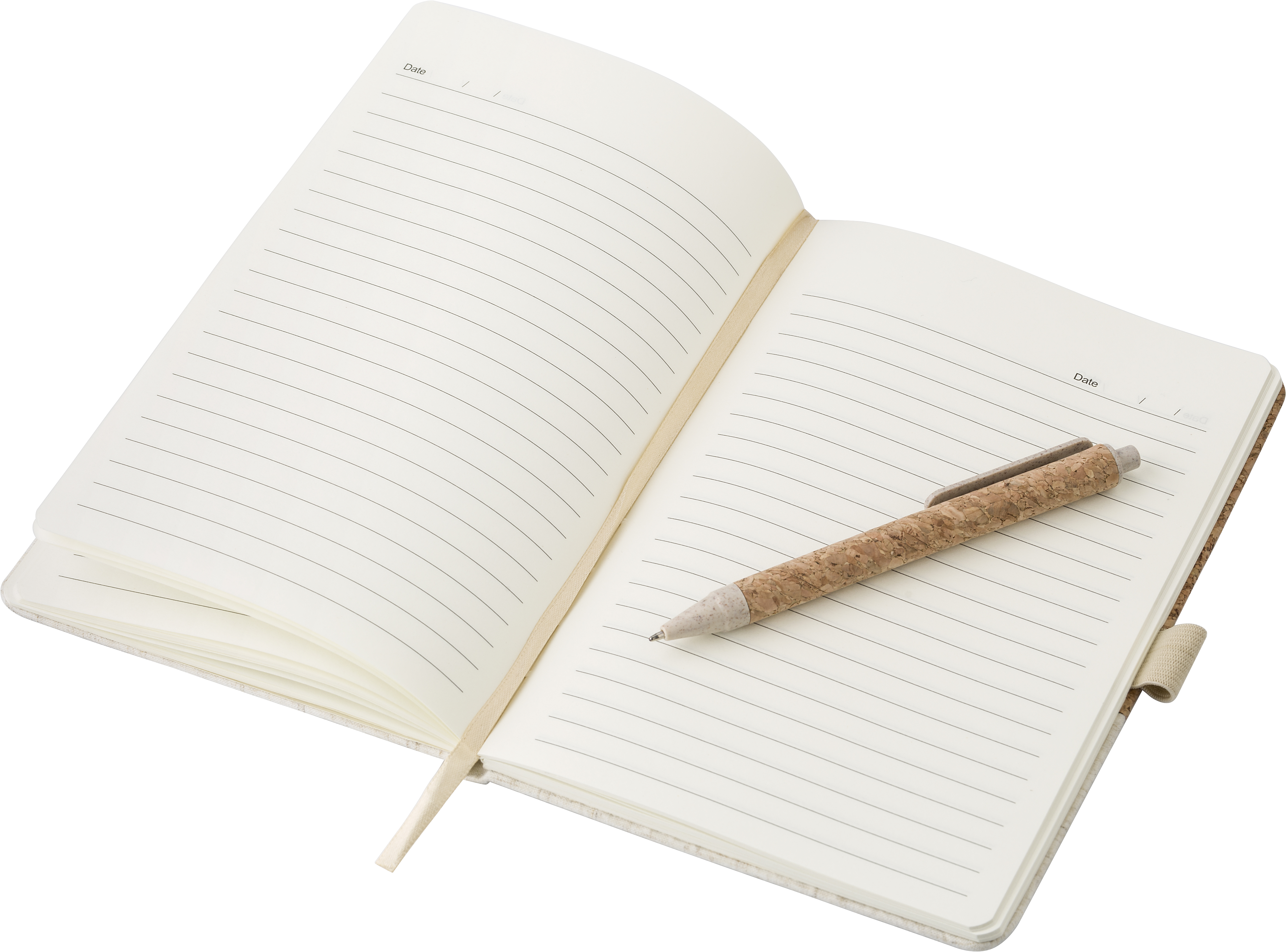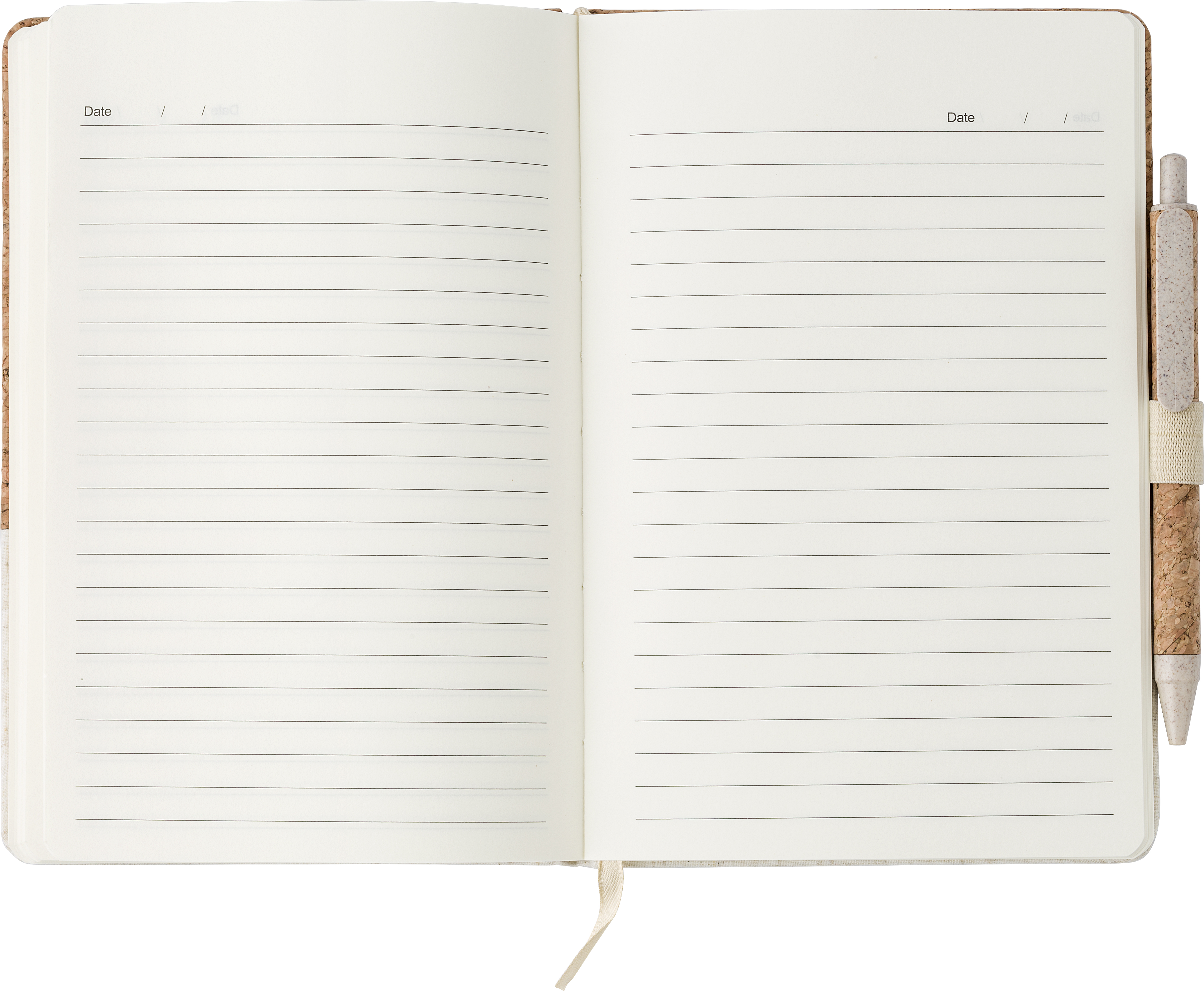 Notizbuch aus Kork und Leinen sowie Kugelschreiber aus Kork und Weizenstroh in einer Pappschachtel. Das Notizbuch hat eine elastische Stiftschlaufe und 80 Blatt linierte Seiten. Schreibfarbe des Kugelschreibers ist blau.