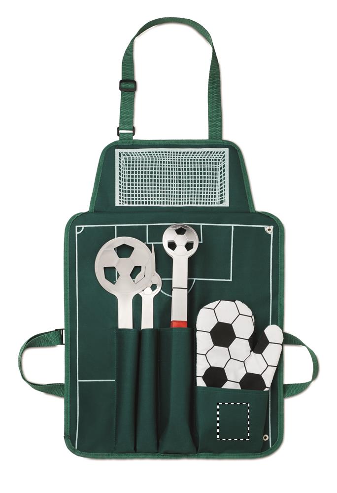 Fußball Grillschürze mit Zange, Gabel, Grillwender und Topfhandschuh. Alles im Fußball Design. Schürze aus 600D Polyester.