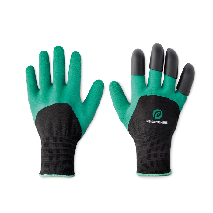 Ein Paar Gartenhandschuhe mit speziellen Fingerspitzen zum Graben (nur am rechten Handschuh).