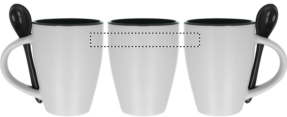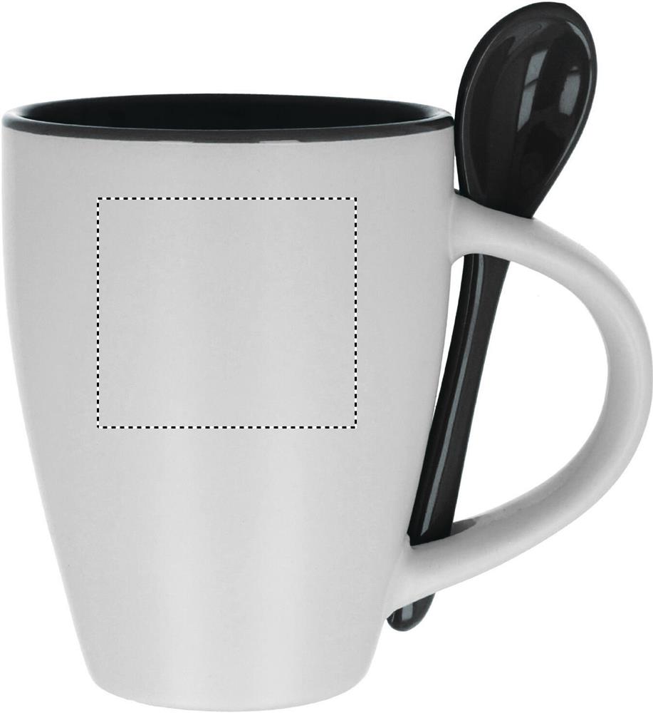 Zweifarbiger Kaffeebecher aus Keramik mit Löffel. Füllmenge: 250 ml. Nur Keramik-Transferdruck ist spülmaschinengeeignet. Verpackt in einem Karton.