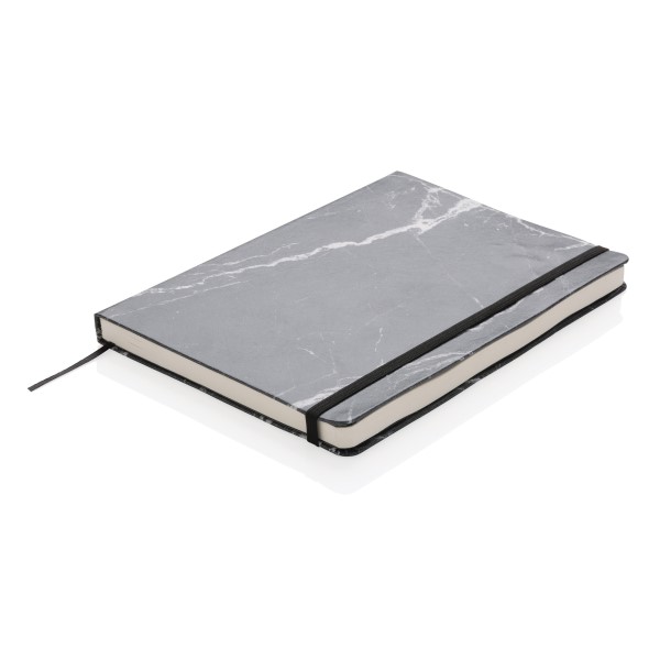 Liniertes Hardcover Notizbuch A5 aus PU in Marmor-Optik mit Seitentrenner und elastischem Verschlussband. 192 Seiten, 80g/m² - creme-farbene Seiten.