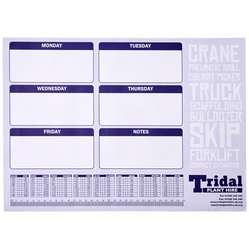 Weißer Desk-Mate® A2 Notizblock mit 80g/m2 Papier. Vollfarbdruck auf jedem Blatt möglich. Erhältlich in 2 Größen: 25, 50 Blatt.