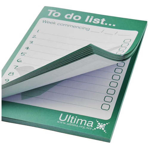 Weißer Desk-Mate® A6 Notizblock mit 80g/m2 Papier. Vollfarbdruck auf jedem Blatt möglich. Erhältlich in 3 Größen: 25, 50, 100 Blatt.