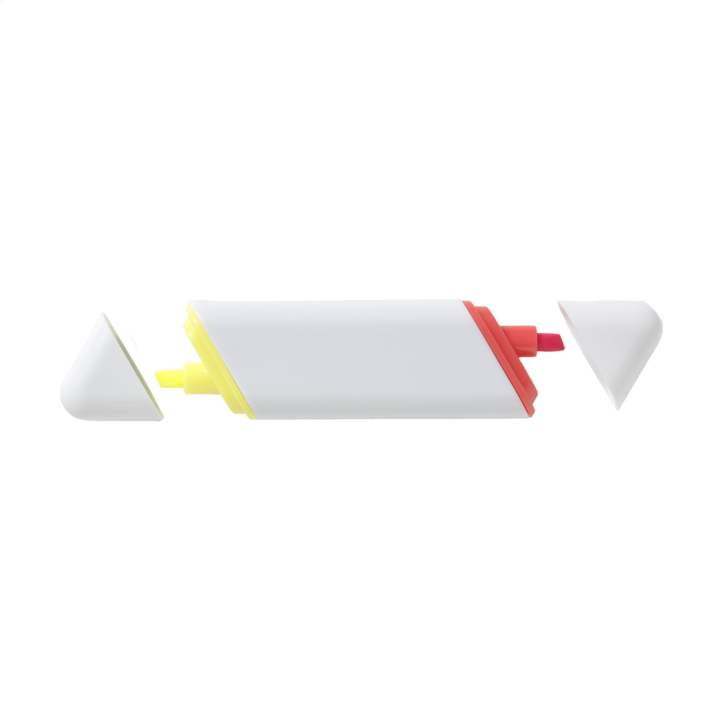 Textmarker mit 2 verschiedenen Neonfarben und Spitze in Spachtelform und damit in zwei verschiedenen Schreibbreiten.