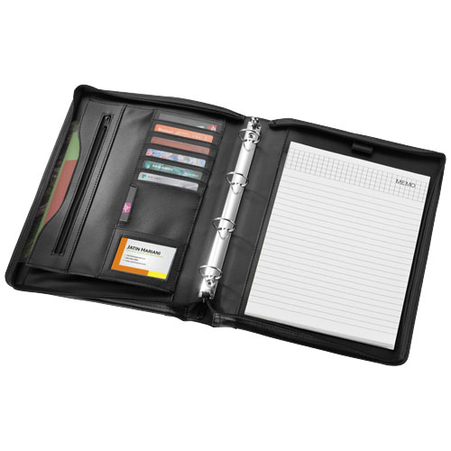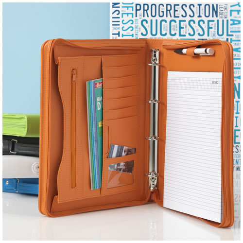 Mappe mit Griff, Reißverschluss, Ringbuch, Reißverschlusstasche und Dokumentenfächern. Mit Notizblock mit 20 Blatt.