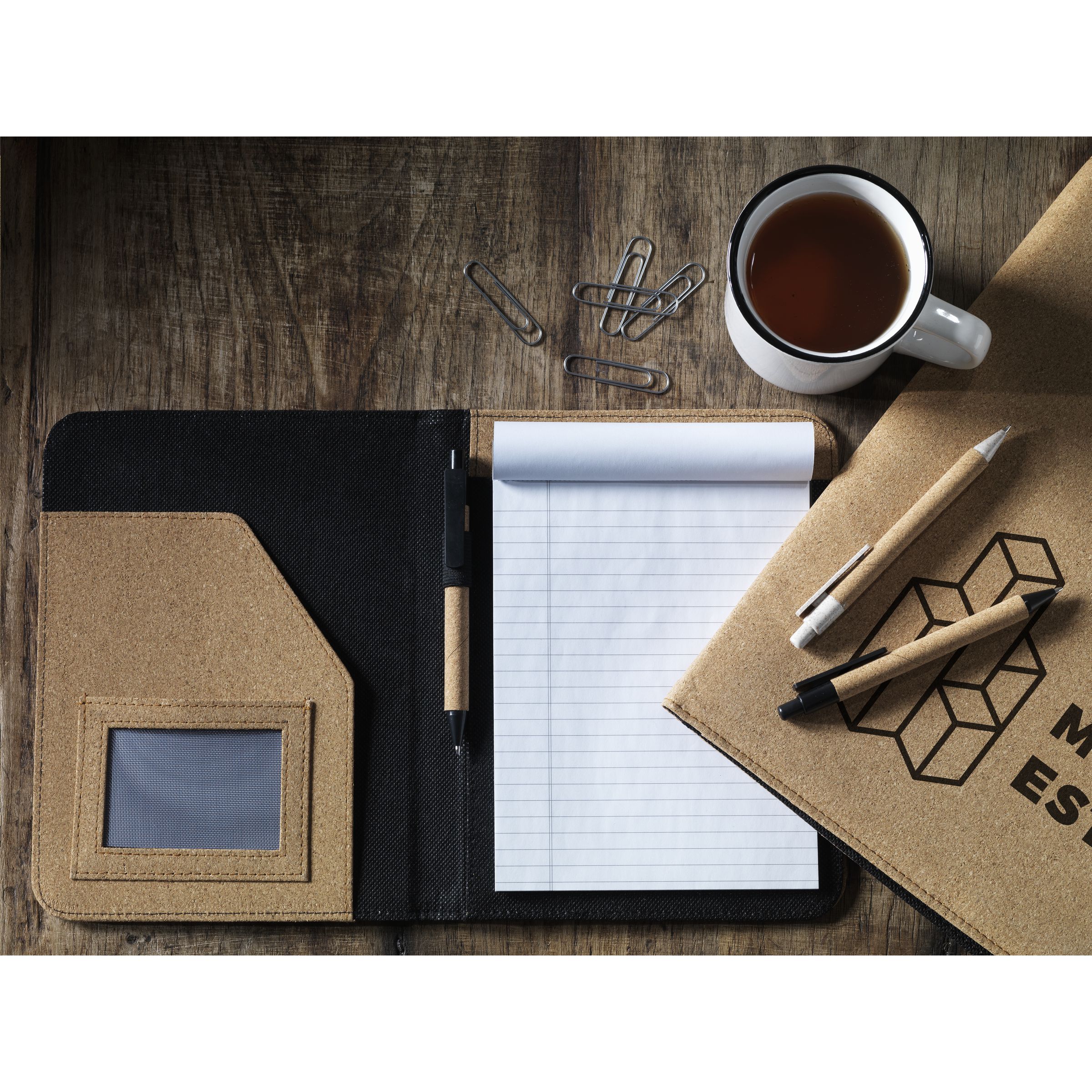 WoW! Schreibmappe/Dokumentenmapp im A5-Format, mit FSC Mix zertifiziertem Korküberzug und Einsteckfach mit Kreditkartenfach. Innen mit Vliesstoff ausgekleidet. Inkl. liniertem Schreibblock (ca. 30 Blatt) und Kugelschreiber mit blauer Tinte aus Kork und Weizenstroh.