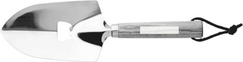 Gartenschaufel aus rostfreiem Stahl mit Holzgriff und PU-Band. Flaschenöffner im Inneren der Schaufel. Einzeln verpackt in einer braunen Papierschachtel.