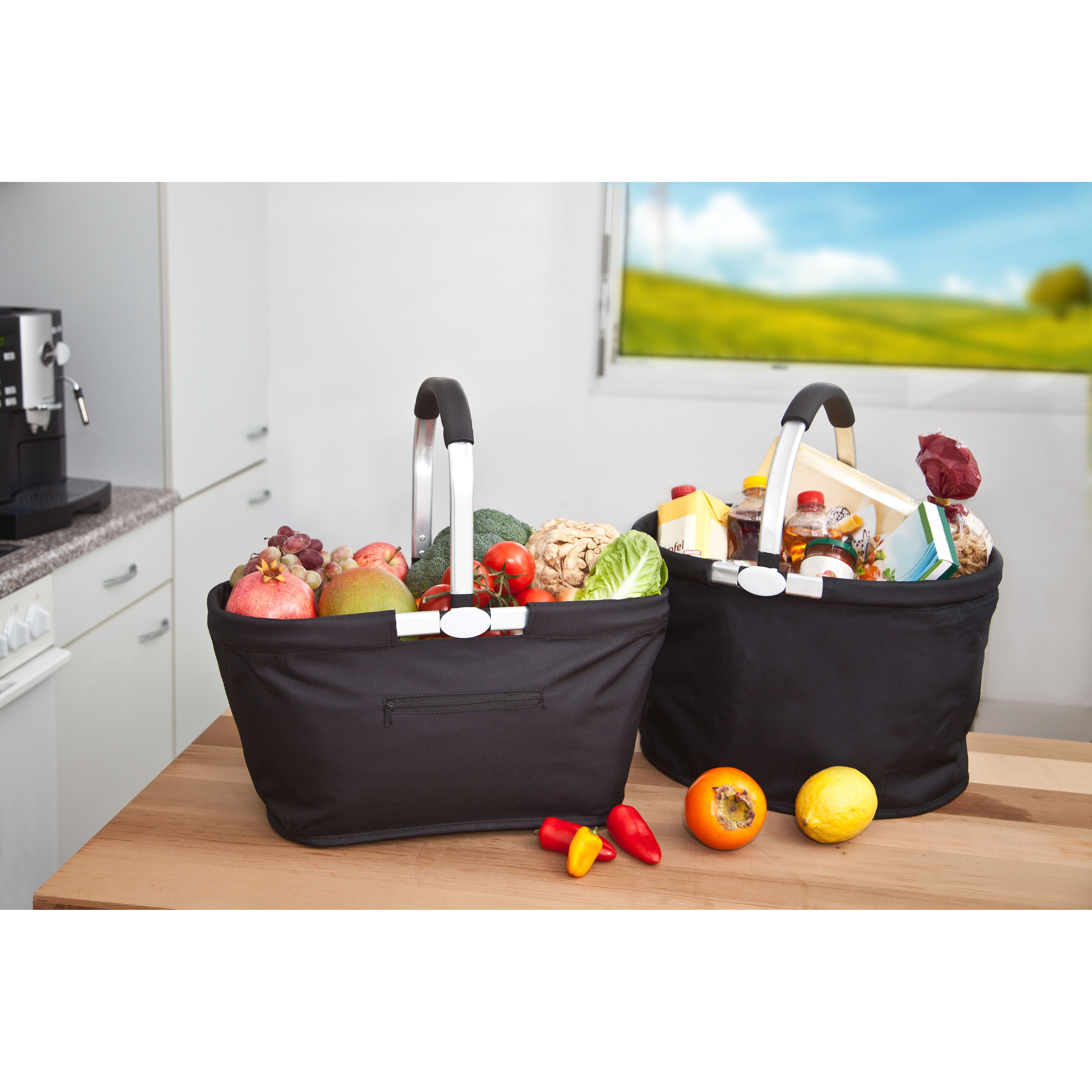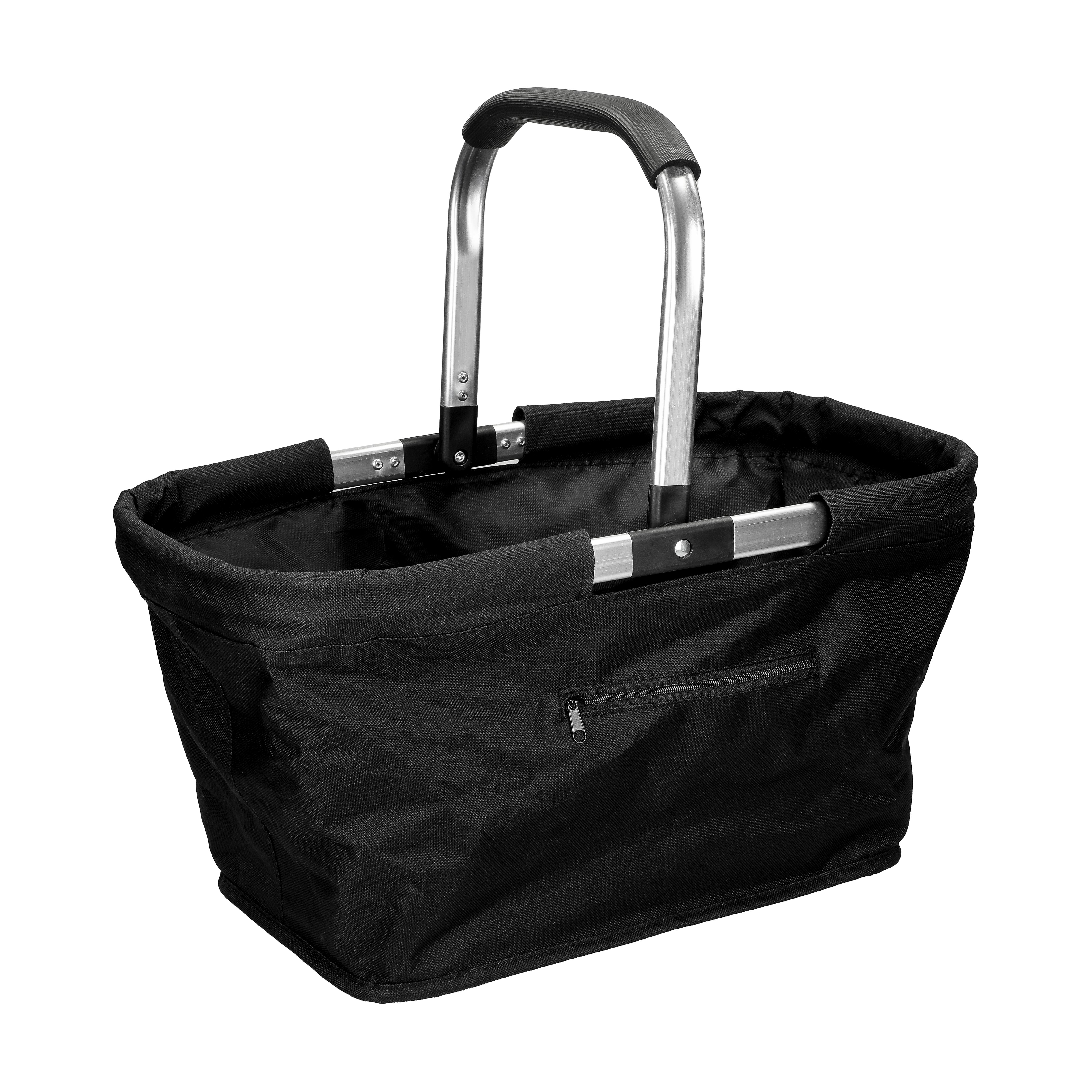 So macht einkaufen Spaß. Geräumiger, rechteckiger Einkaufskorb aus leichtem, stabilem Alurahmen, fortlaufend umnäht mit doppellagigem Polyester. Der klappbare Henkel hat einen weichen EVA-Griff für angenehmes Tragen.