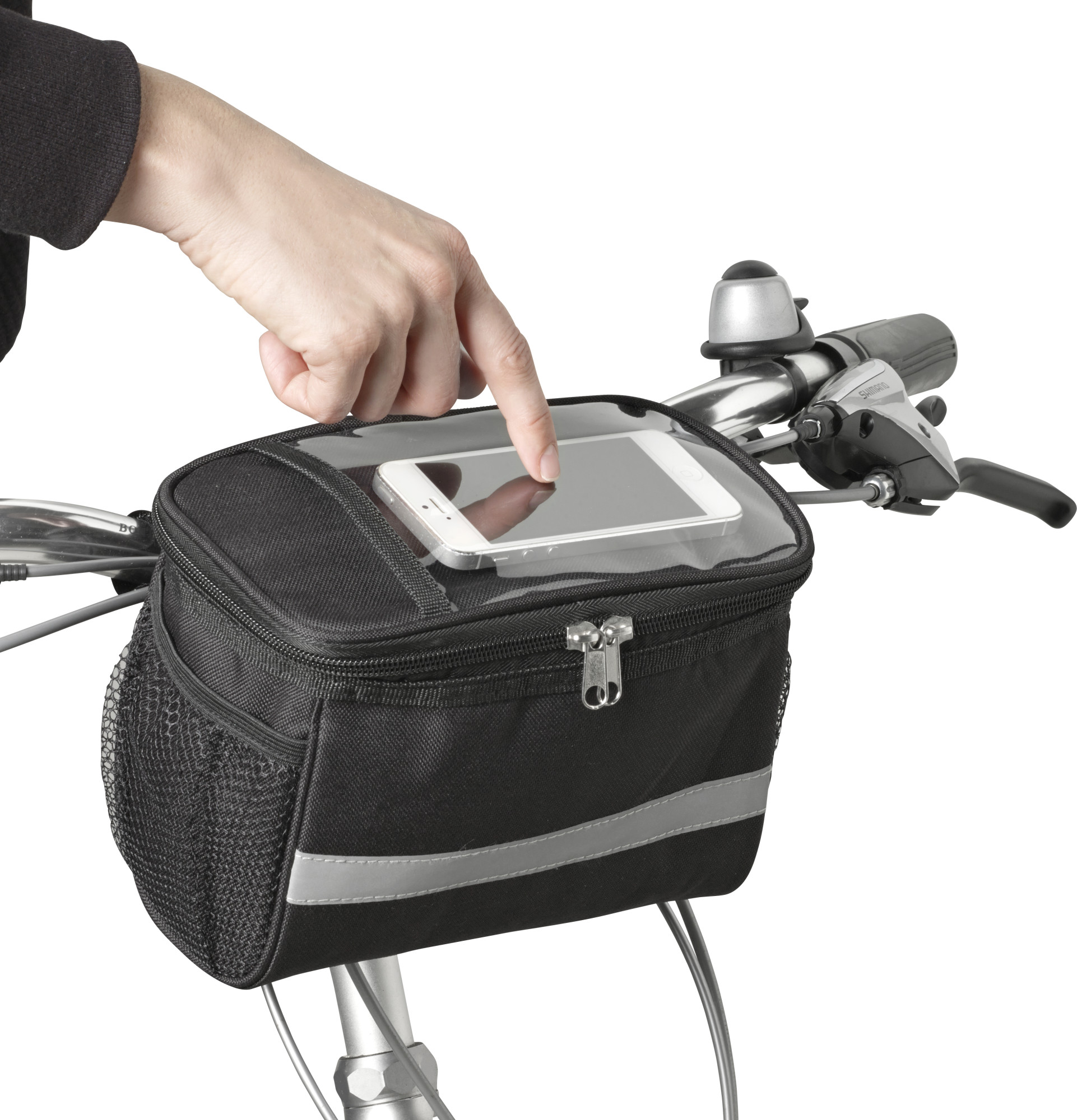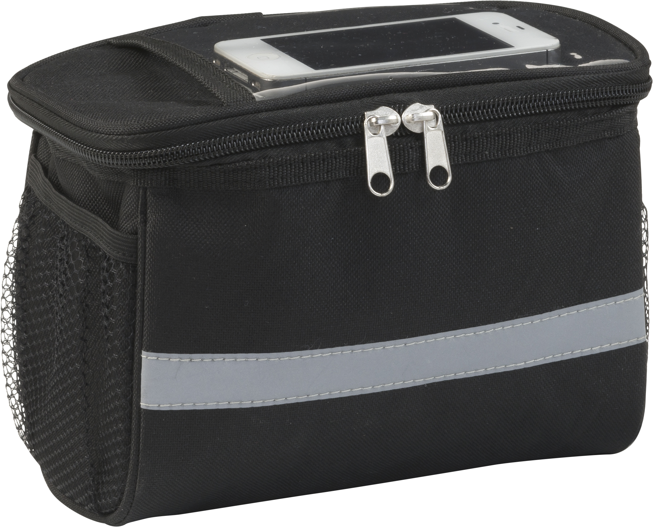 Fahrradlenker-Kühltasche aus Polyester (600D), mit RV-Hauptfach, 2 Netzfächern, Klettverschluss, PVC-Sichtfach und Reflektorstreifen.