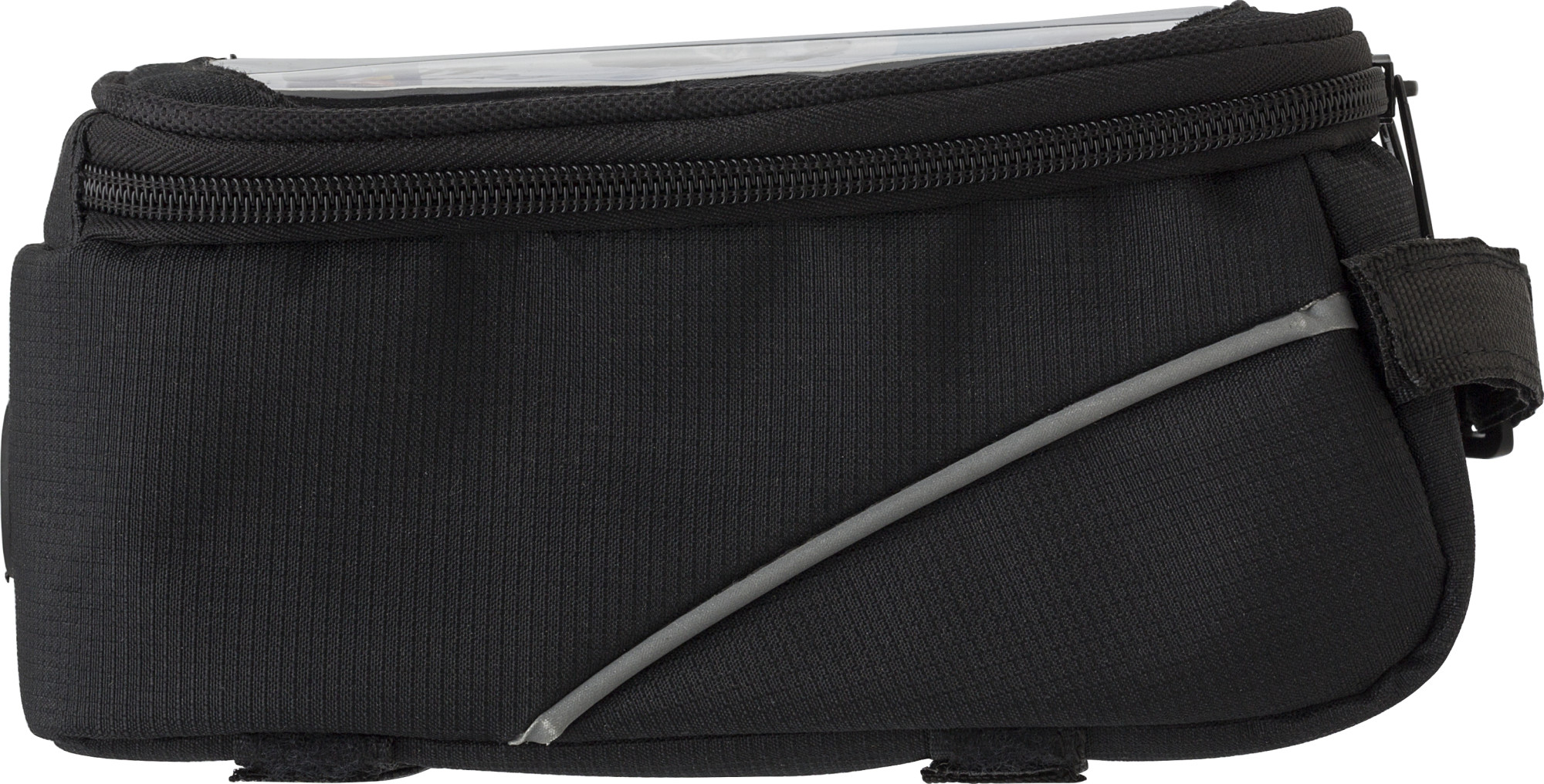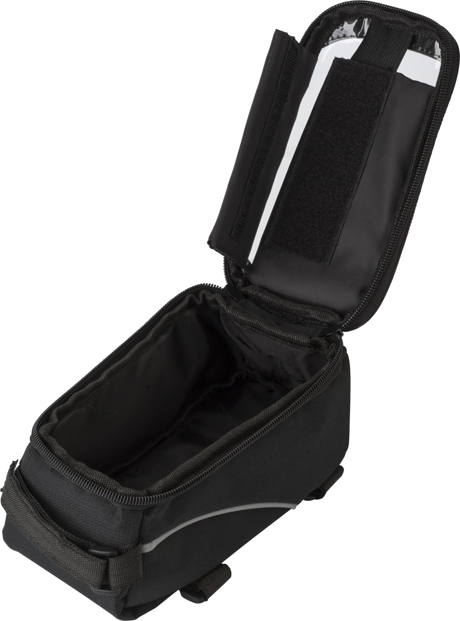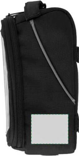 Fahrradlenkertasche aus Polyester (600D) und PVC mit separatem Fach an der Oberseite für ein Mobiltelefon. Der Touchscreen des Telefons kann durch die PVC-Abdeckung weiterhin benutzt werden.
