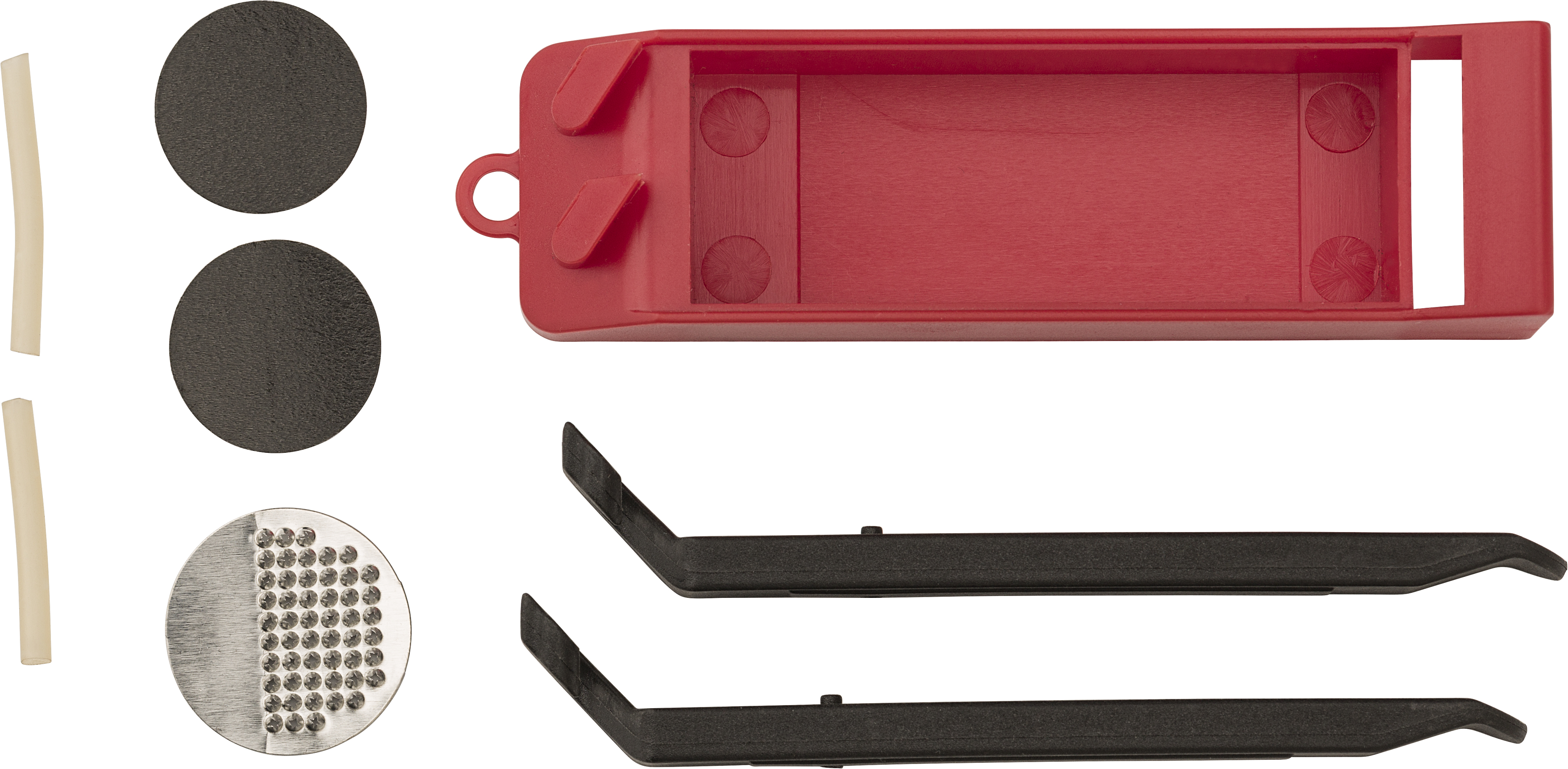 Reparatur-Set für Fahrradreifen in Kunststoffbox, bestehend aus Reifenhebern, Aufrauher, selbstklebenden Patches und Ventilgummi.