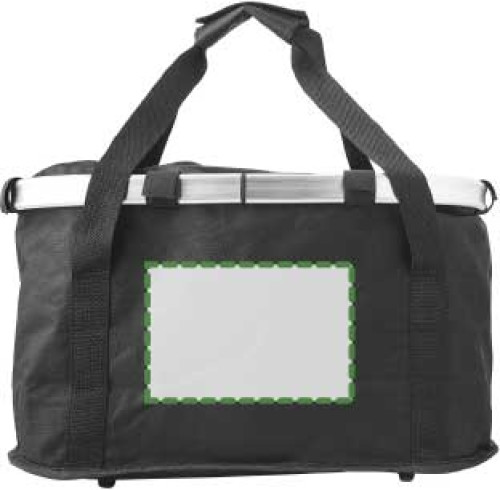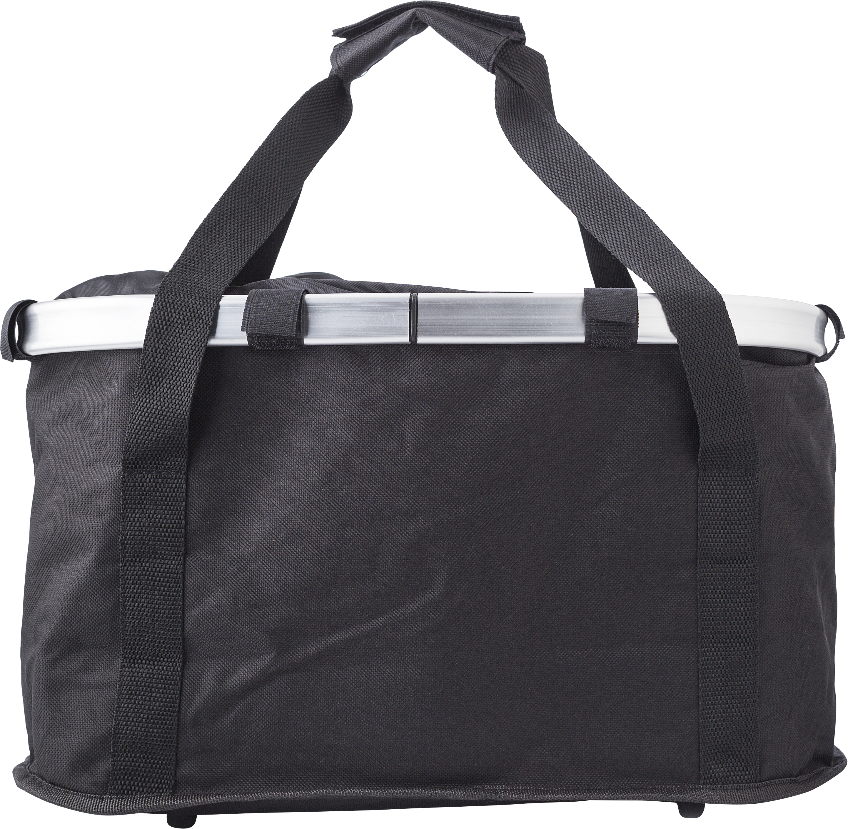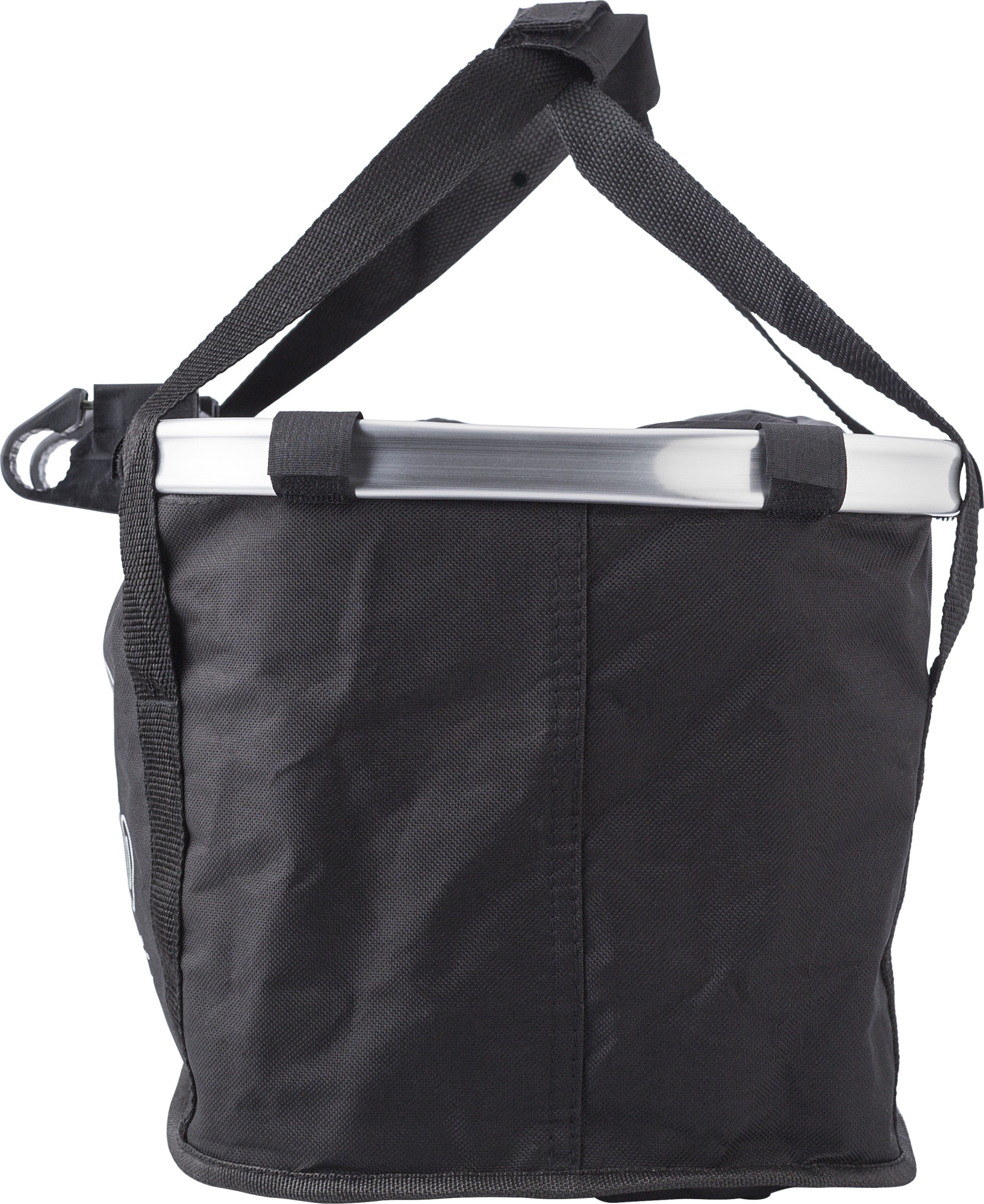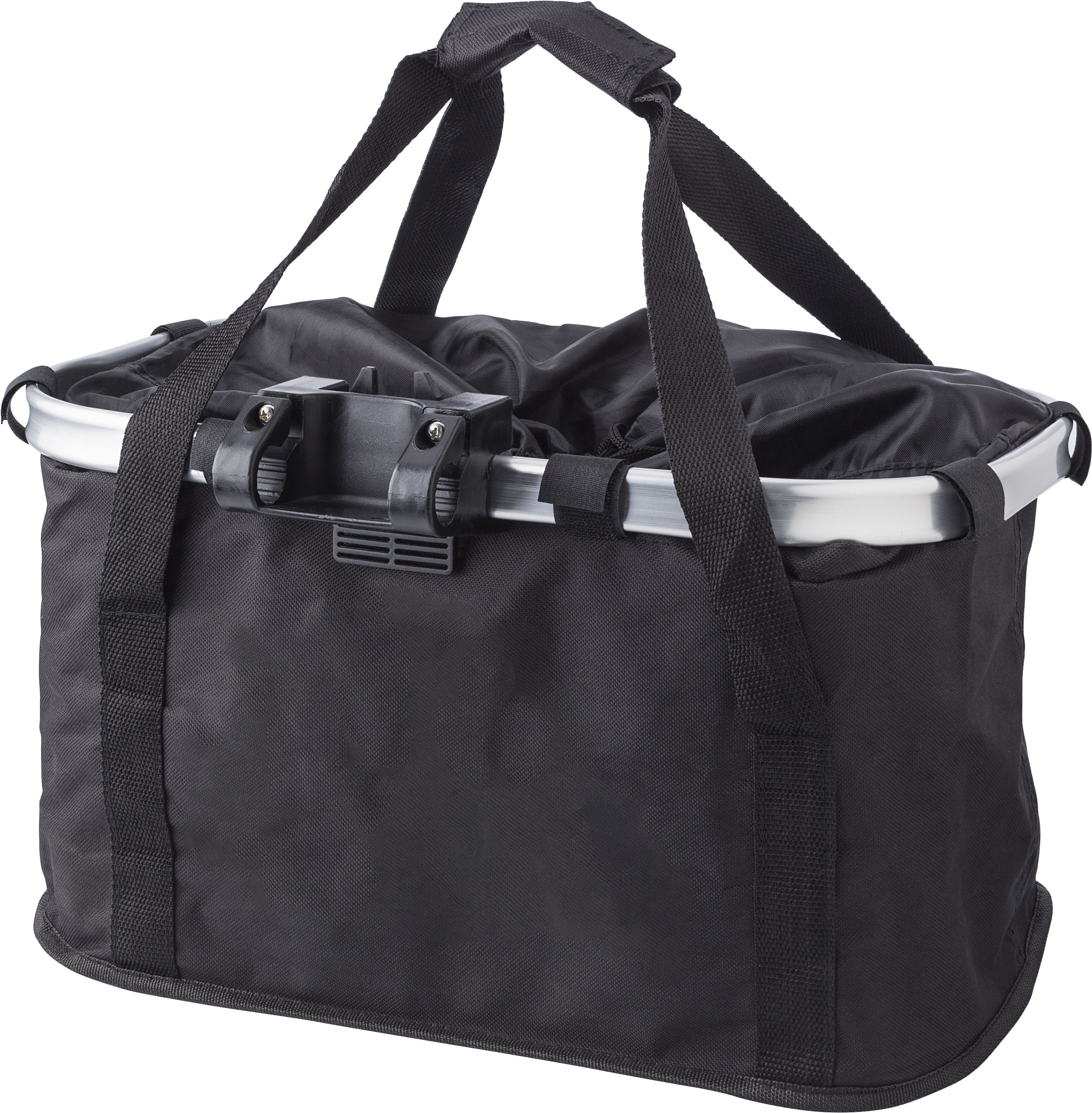 Fahrradtasche aus Polyester (600D), welche mit einem Ring und Klettverschluss an den den Fahrradlenker befestigt werden kann. Die Tasche hat einen Tunnelzug, Tragegriffe und einen Schultergurt.