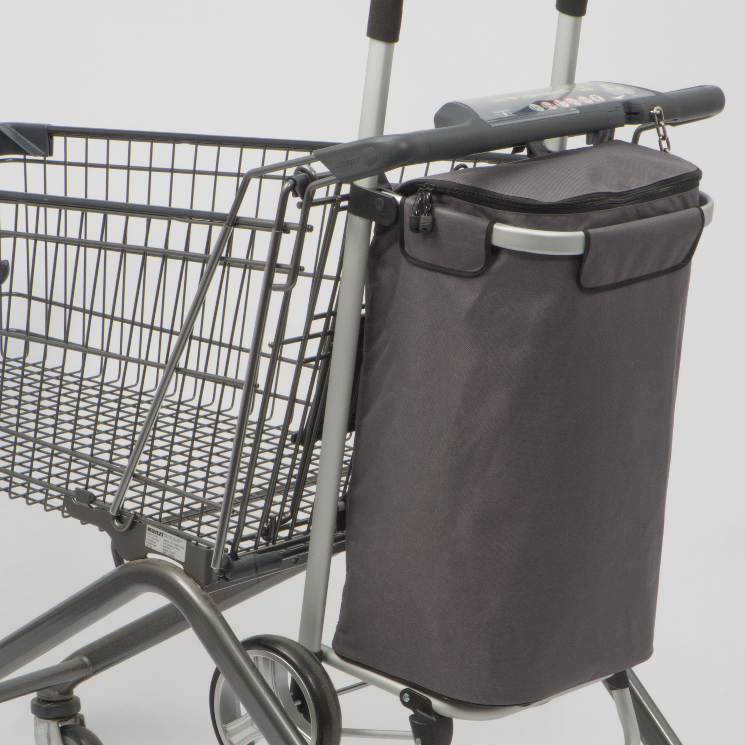Faltbarer Einkaufstrolley aus Polyester mit Aluminiumgestänge, integriertem Kühlfach und Haken, um am Einkaufswagen befestigt zu werden. Ihre Werbung wird auf den Deckel gedruckt.