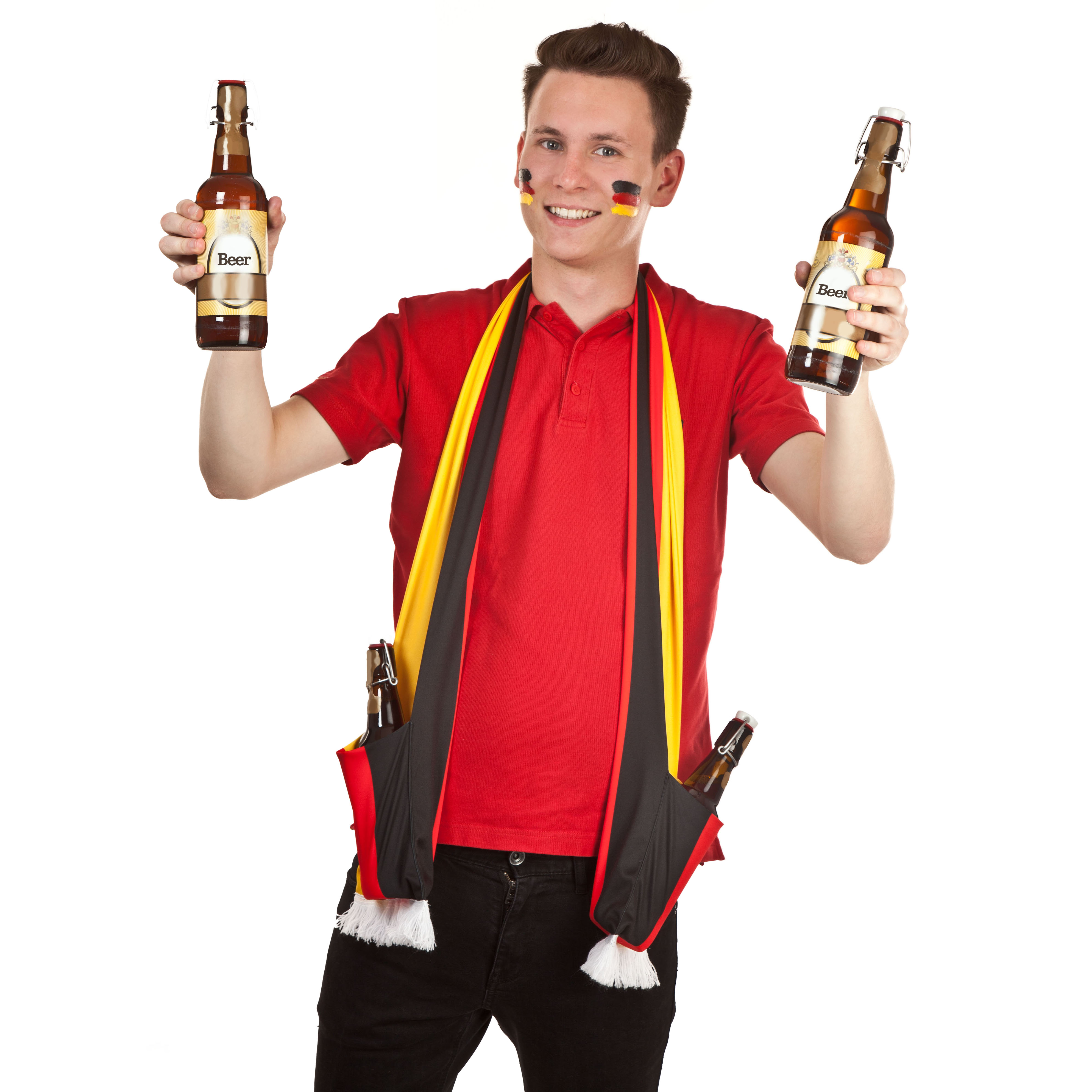 Mehr als "nur" ein Schal. Tolles Fan-Accessoire in Deutschlandfarben mit weißen Fransen und einer angenähten Tasche an jeder Seite. Ideal für die Hände, Smartphones oder auch beim Transportieren von Getränken.