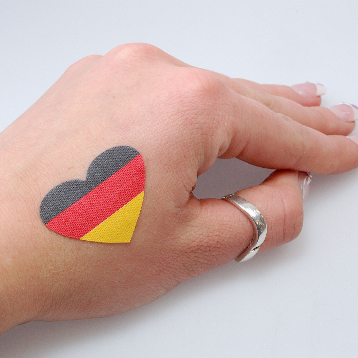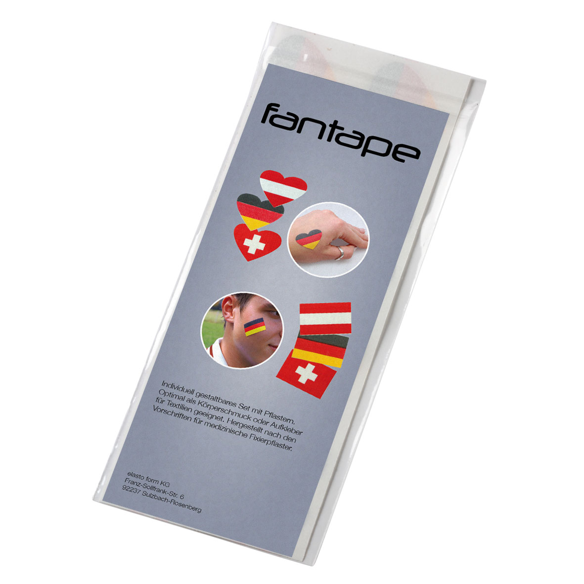 Set mit Pflastern in Herz-Form. 4-farbiger Papiereinleger (55 x 140 mm) und Polybeutel inklusive. Optimal als Körperschmuck oder Aufkleber für Textilien geeignet. Hergestellt nach den Vorschriften für medizinische Fixierpflaster. Beim Einleger kann zwischen Standard (siehe Abbildung) oder einem individuell gestalteten Einleger gewählt werden.