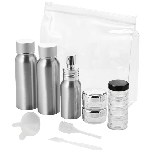 Enthält 2 80 ml Aluminiumflaschen, 1 30 ml-Aluminium Sprühflasche, 2 0,5 ml Gläser, 1 Glas mit 4 Ebenen, einen Trichter, einen Spatel und einen Sauger. Flaschen, Trichter usw. im Kunststoffbeutel verpackt, werden getrennt vom Beutel geliefert.