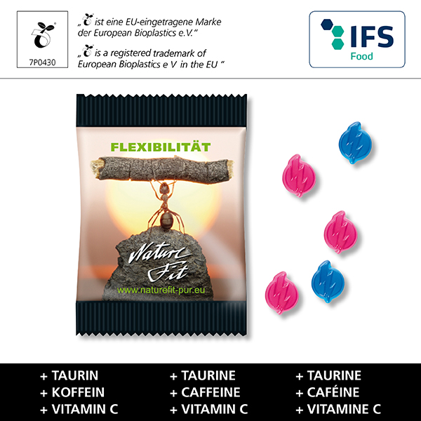 Weitere Kategorien mit ähnlichen Artikeln wie Fruchtgummi Power-Blitz in kompostierbarem Werbetütchen