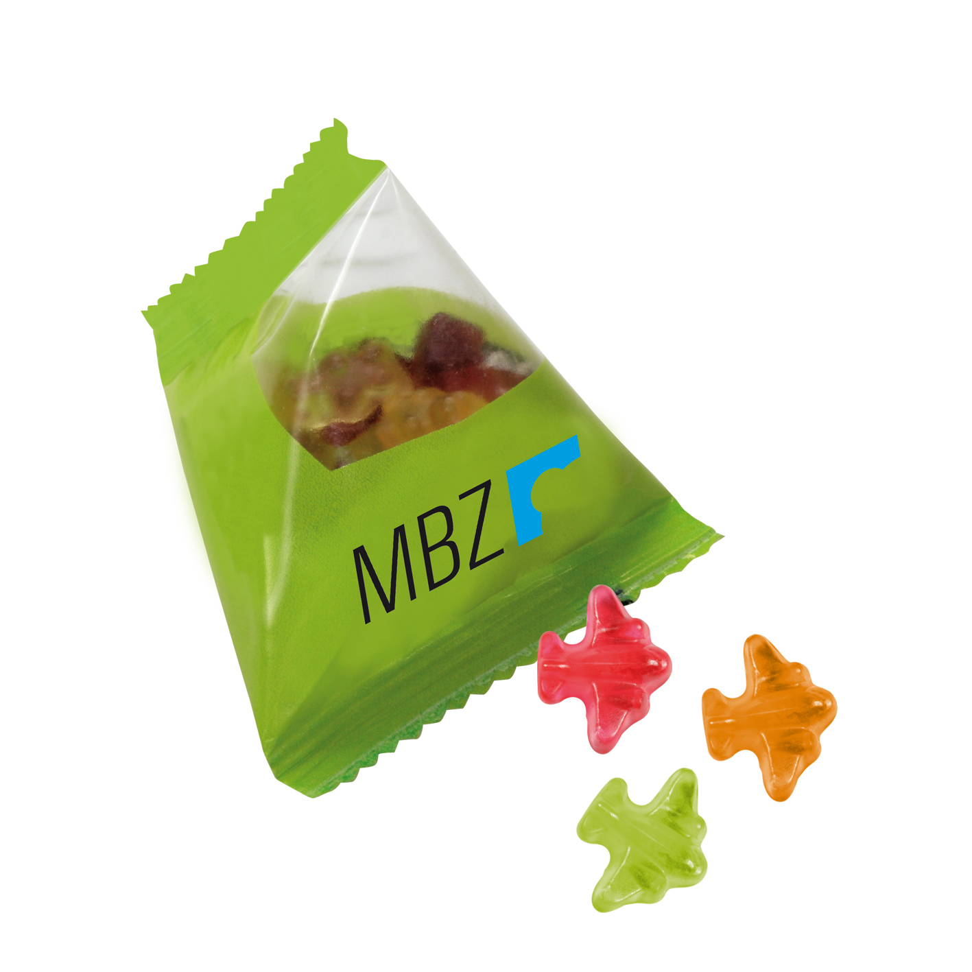 Produkt: Tetraeder aus weißer Folie, individuell bedruckt br>Inhalt: Fruchtgummi der Marke Trolli, Premium-Qualität, 10 % Fruchtanteil, bunt gemischt, ca. 15 g br>Haltbarkeit: 12 Monate br>Preise: € / Tetraeder inkl. 4-c Flexodruck zzgl. Drucknebenkosten.