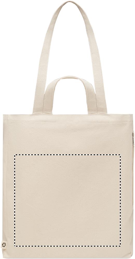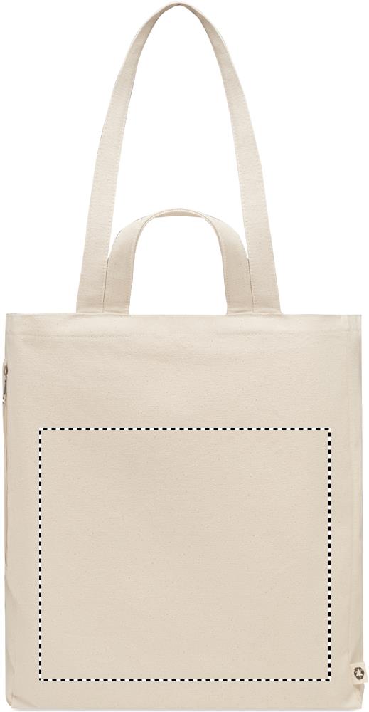 Einkaufs- oder Strandtasche aus recyceltem Polycotton (70 % recycelte Baumwolle, 30 % recycelter Polyester) mit kurzen Tragegriffen. Innentasche mit Reißverschluss. 380 g/m².