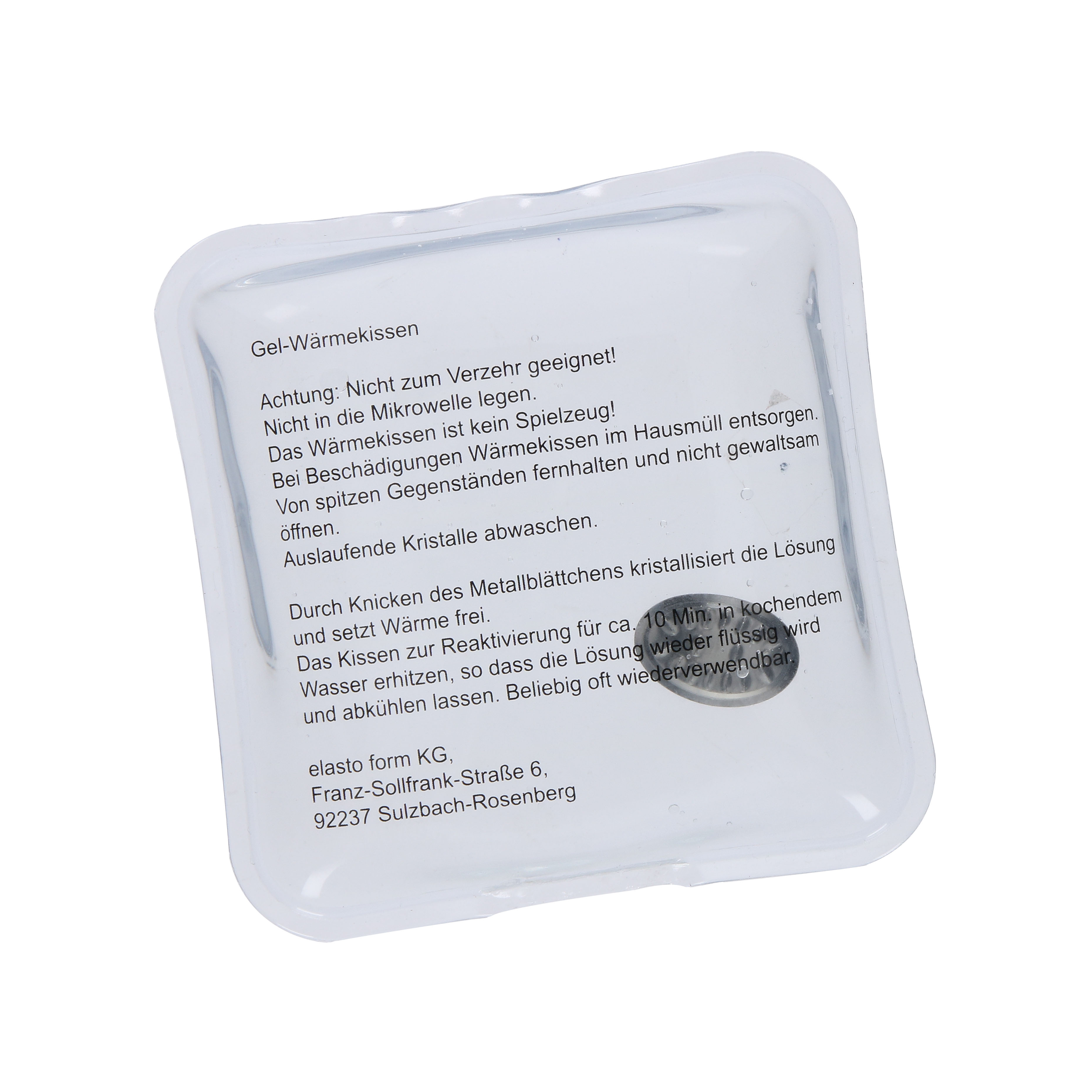 Gibt ca. 15 Minuten optimale Wärme bis 50°C bei Kristallisation der Flüssigkeit durch Knicken des Metallplättchens. Nach Gebrauch das Wärmekissen 10 Minuten in 100°C kochendes Wasser legen. Wiederverwendbar.