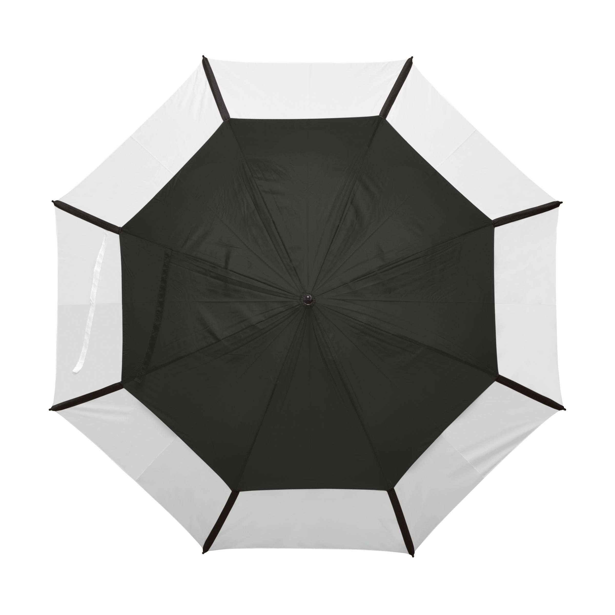 Luxuriöser, doppellagiger Golfschirm mit 190T Polyester- und 190T Nylonbespannung, Sturmfunktion, Windbreakersystem, Glasfaserrahmen und -stiel,vorgeformtem Soft-Handgriff und doppel tem Klettverschluss. In einer Verwahrhülle.