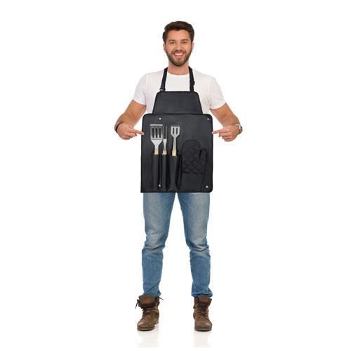 5-teiliges BBQ-Set mit Wender (36,5 x 7 cm), Gabel (36,5 x 2 cm), Zange (36,5 x 5 cm), Handschuh (25 x 16 cm) und einer Schürze mit Tasche (42 x 60 cm). Die Handgriffe sind aus Bambus, der nach nachhaltigen Standards bezogen und produziert wird.