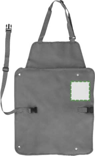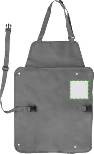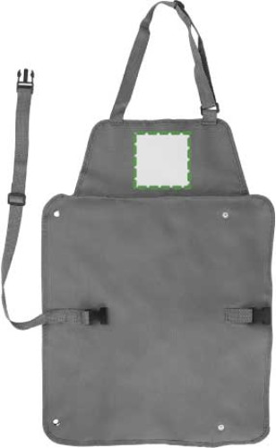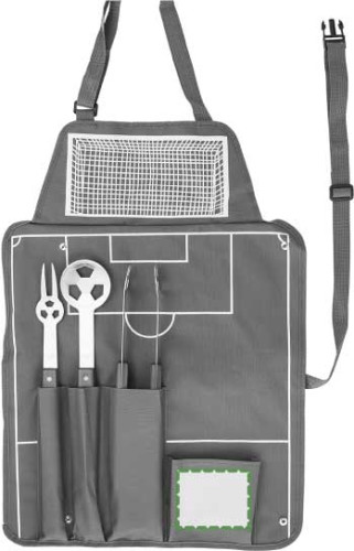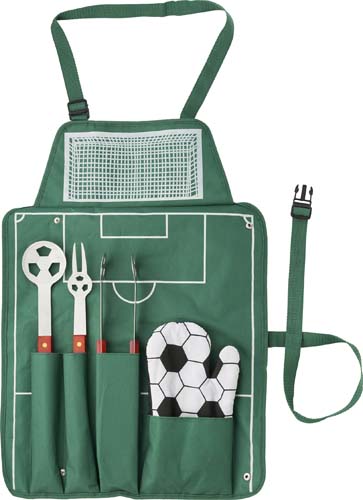 4-teiliges Grillset bestehend aus einer grünen Schürze mit weißem Fußballfeld-Aufdruck, einer Fleischgabel, einem Wender und einer Zange aus Aluminium mit Holzgriffen und Fußball-Stanzung.
