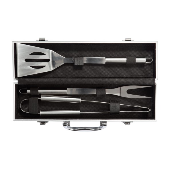 3tlg. Edelstahl Grillset, inkl. Bratenheber, Grillzange und -gabel mit Schutzhülle, Set konfektioniert in Aluminiumkoffer.