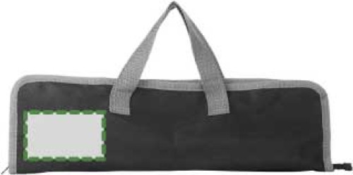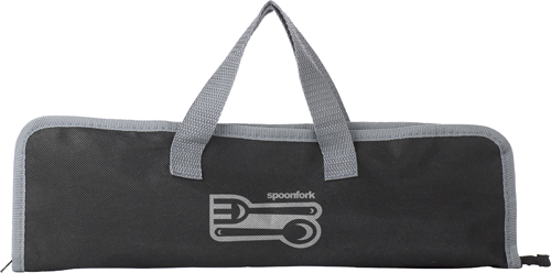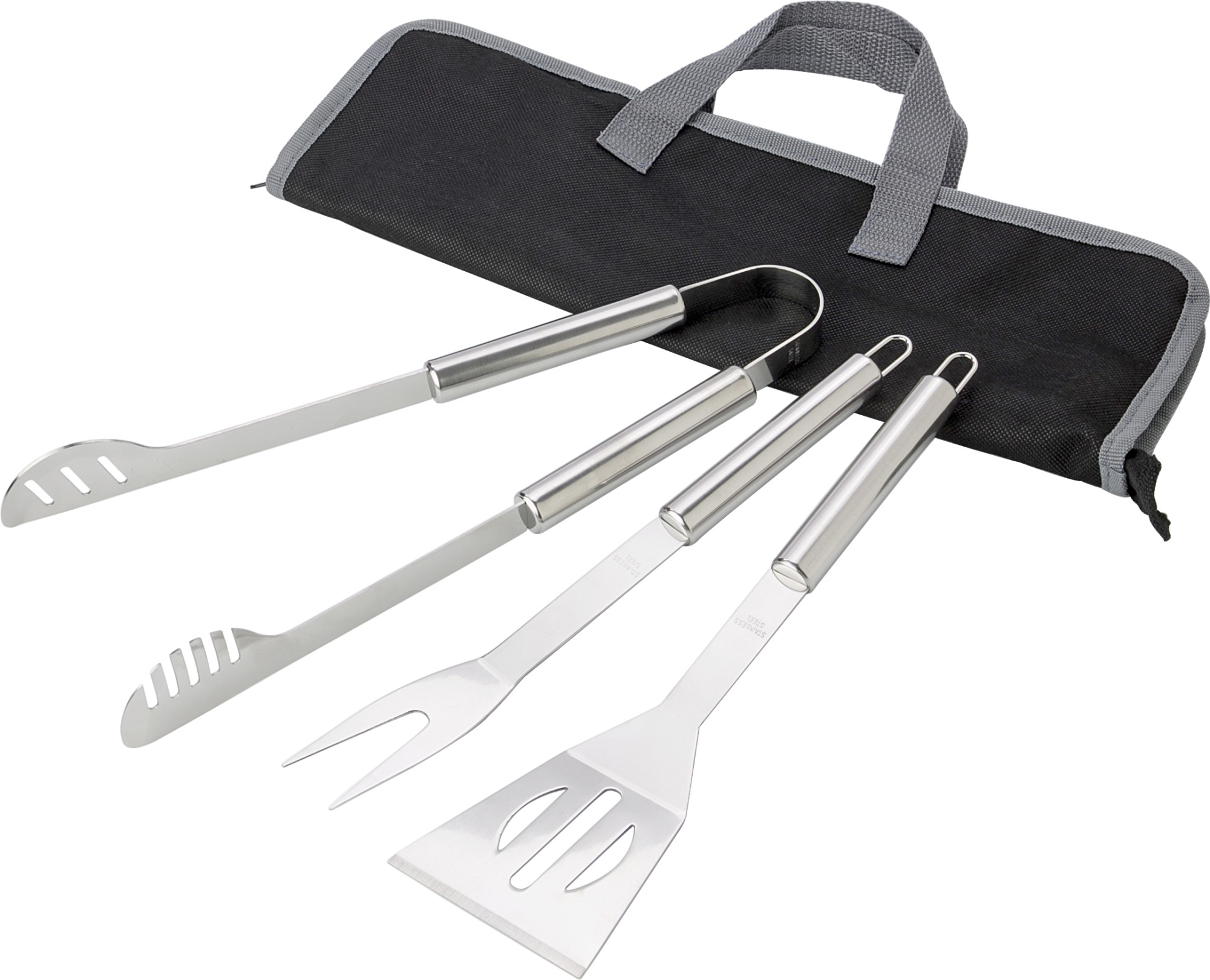 Grillset aus Edelstahl, bestehend aus Zange, Wender, Fleischgabel und Etui aus Non-Woven mit Reißverschluss und Tragegriffen.