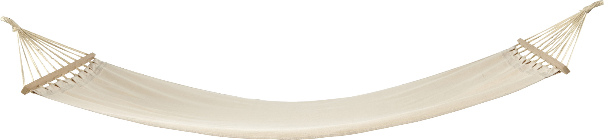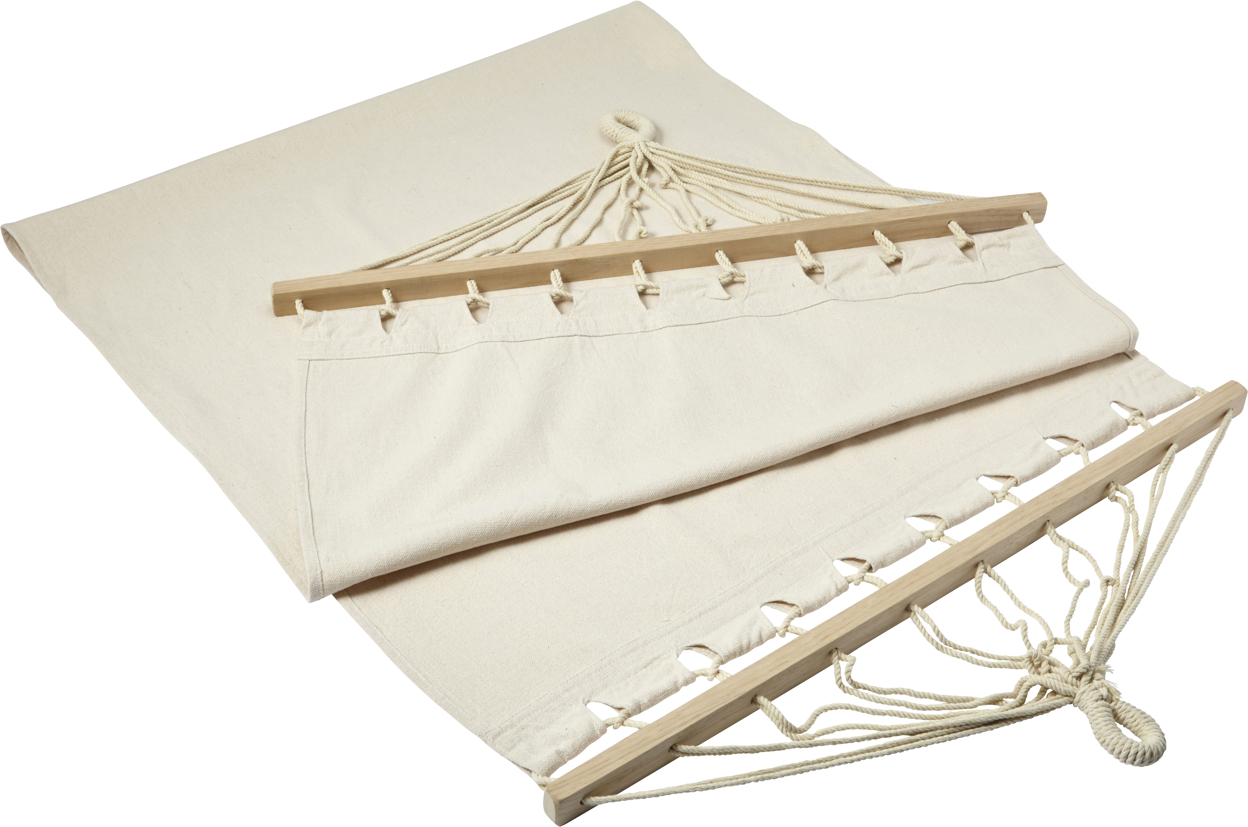 Hängematte aus Canvas, mit Holzstäben und Transporttasche.