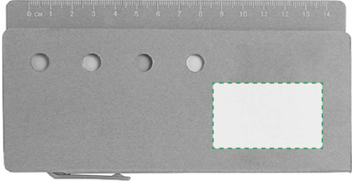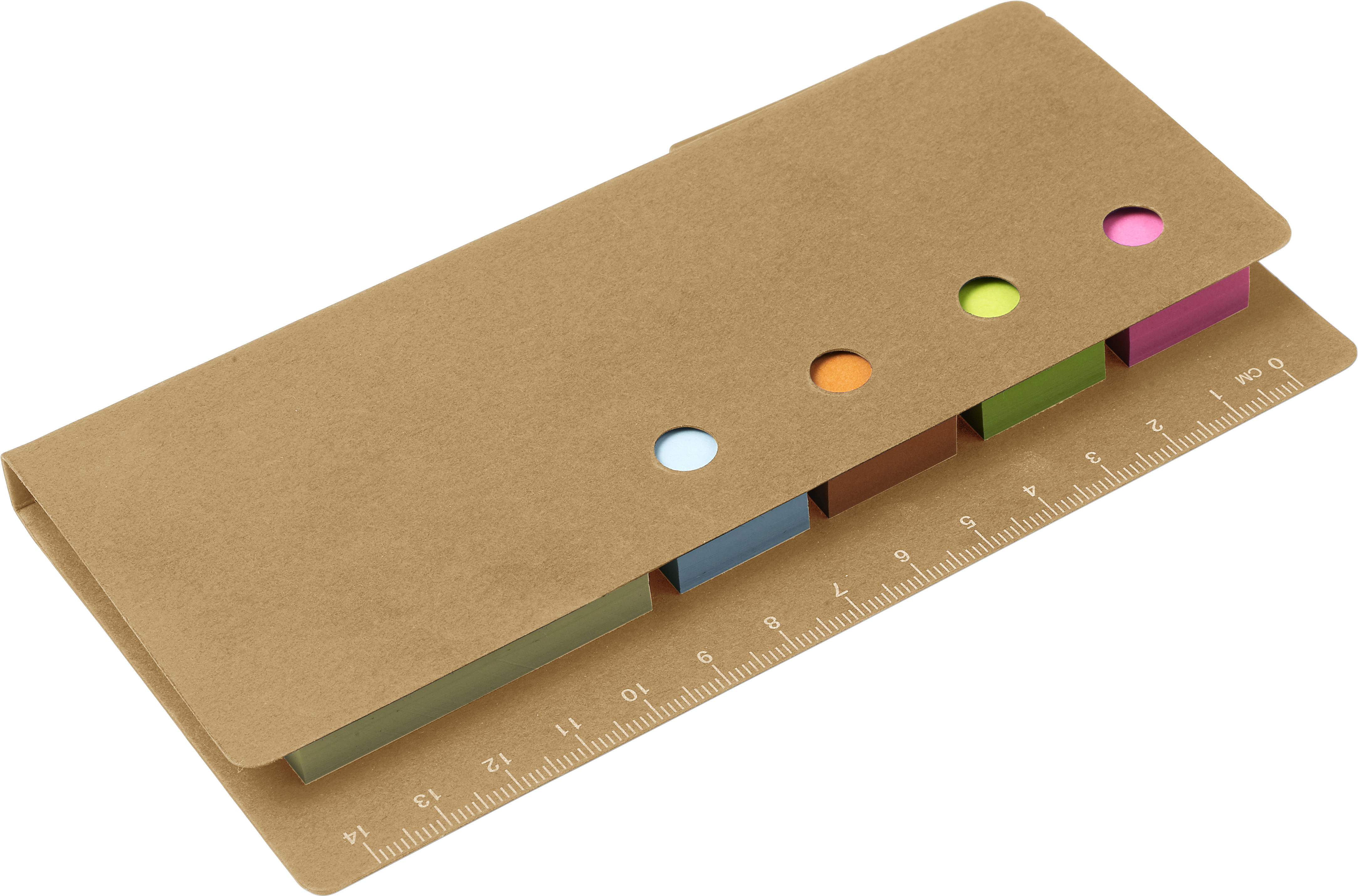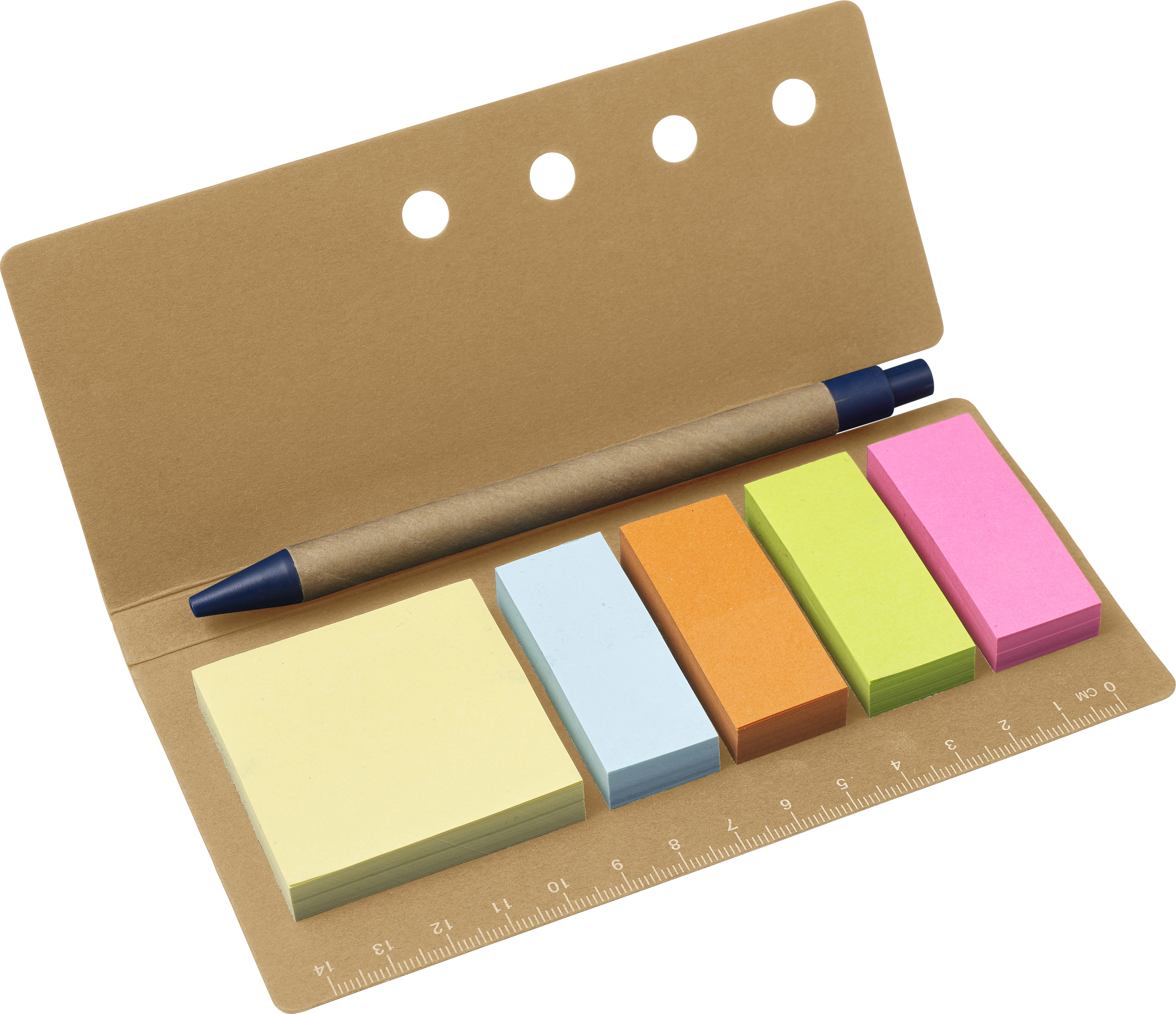 Haftnotizen-Set mit Lineal-Aufdruck, bestehend aus 5 verschiedenen Haftnotizen (je 100 Blatt, 4x klein, 1x groß) und Kugelschreiber aus Karton/Kunststoff (blaue Mine) mit Clip und Spitze aus Kunststoff.